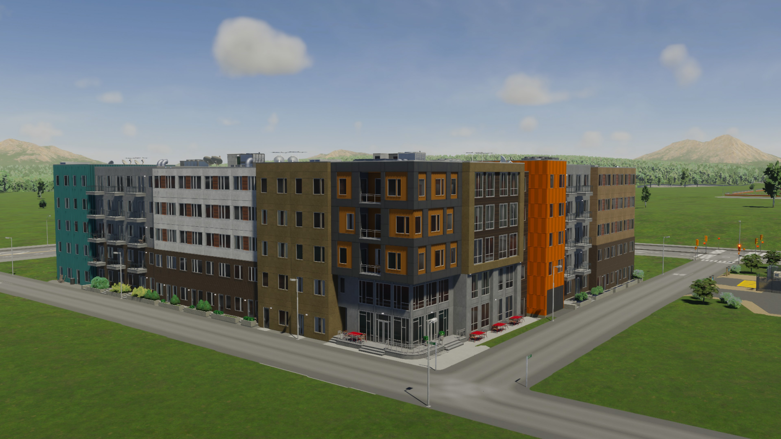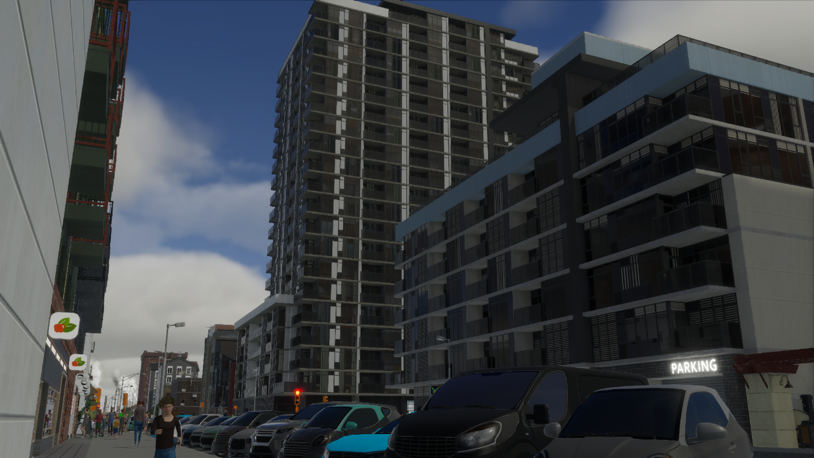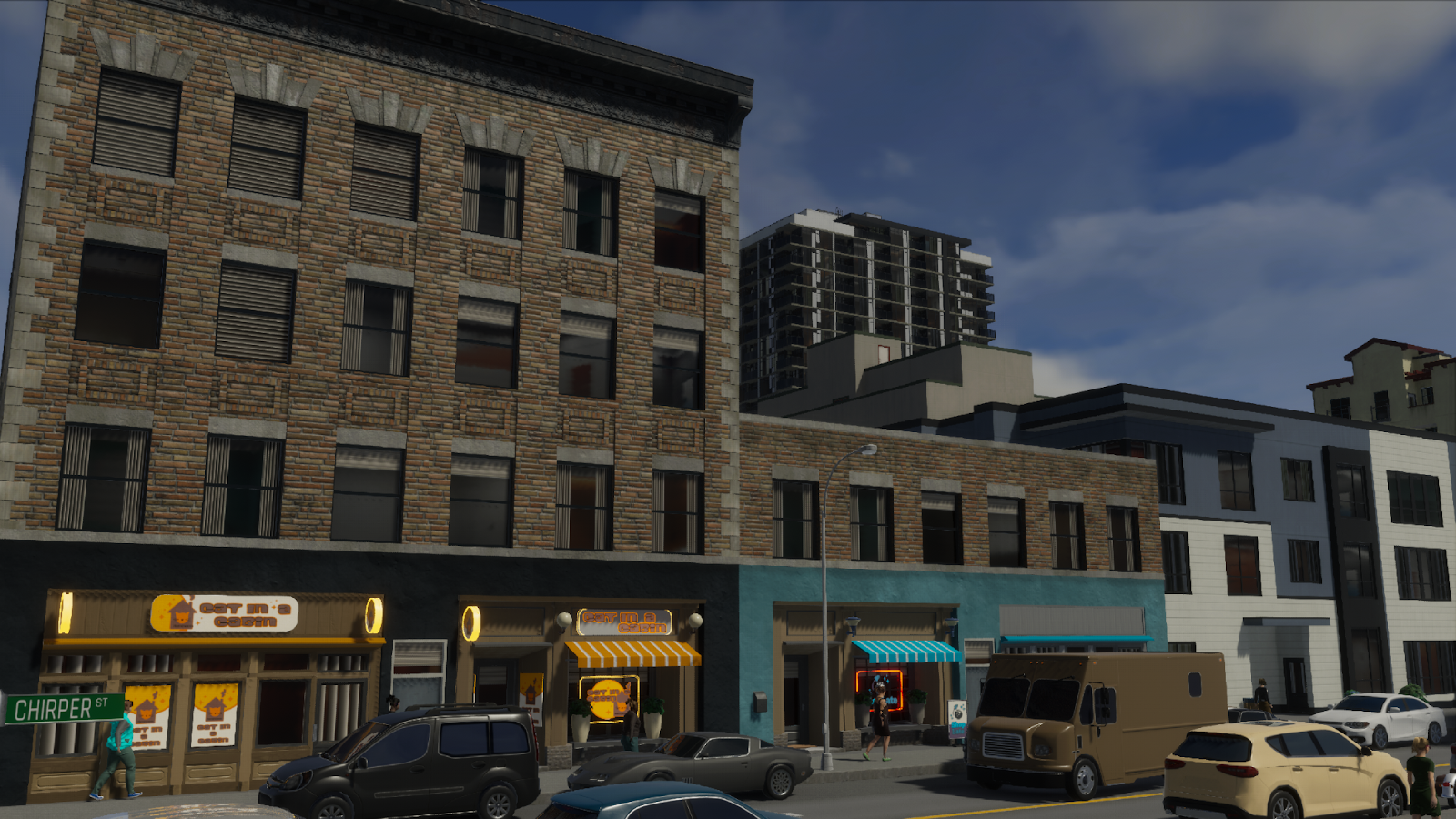 I chose brightly colored modern and newly developed apartment buildings to represent Medium Density zoning. Similar style apartments can be found across the US, and I wanted the buildings to be versatile in their style and the way that they are zoned. Some are wall-to-wall and will have a cohesive look when spawned next to each other, but they work just as well as stand-alone assets. Different techniques and road placement can be used to create a sprawling apartment community.