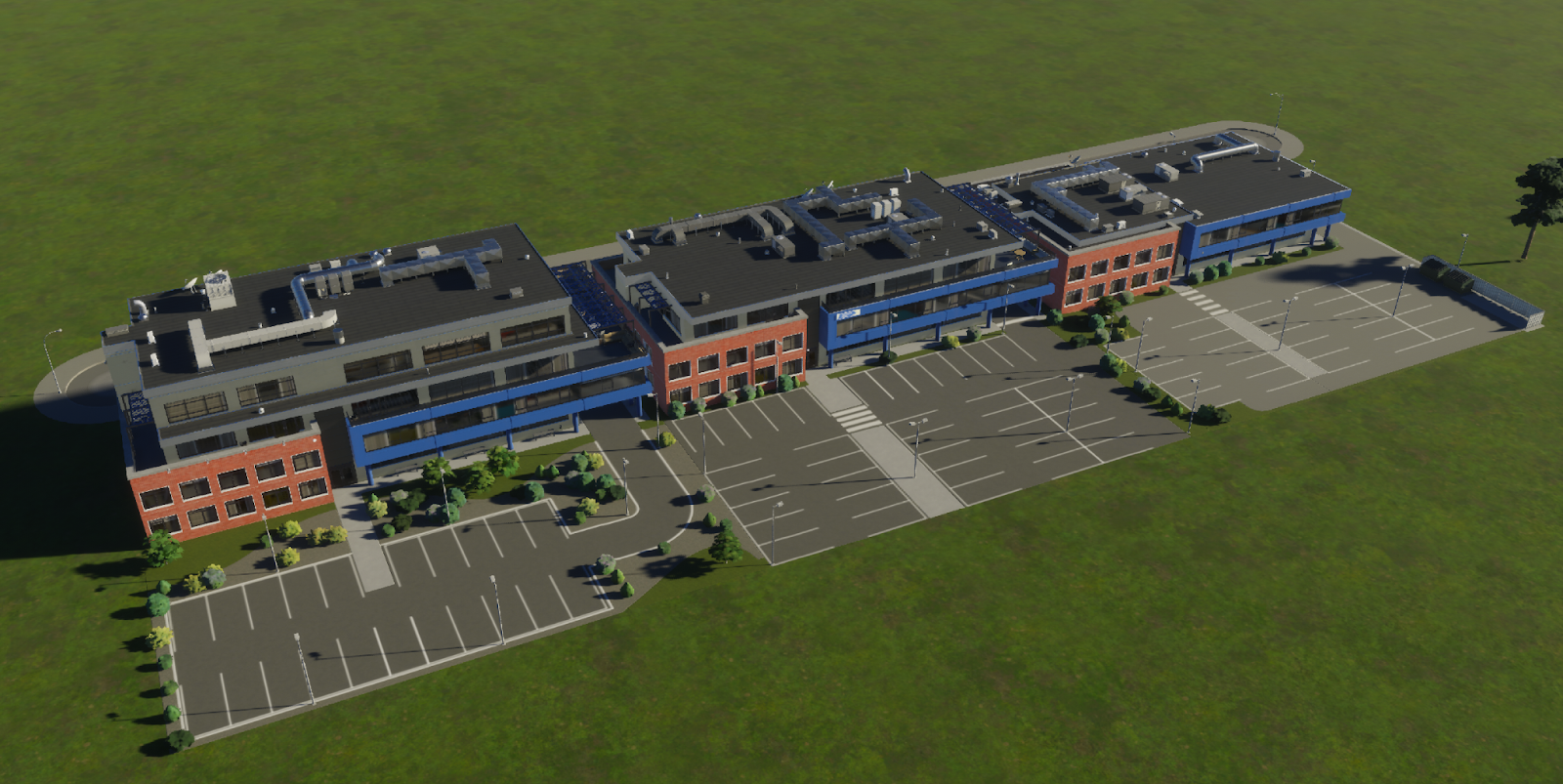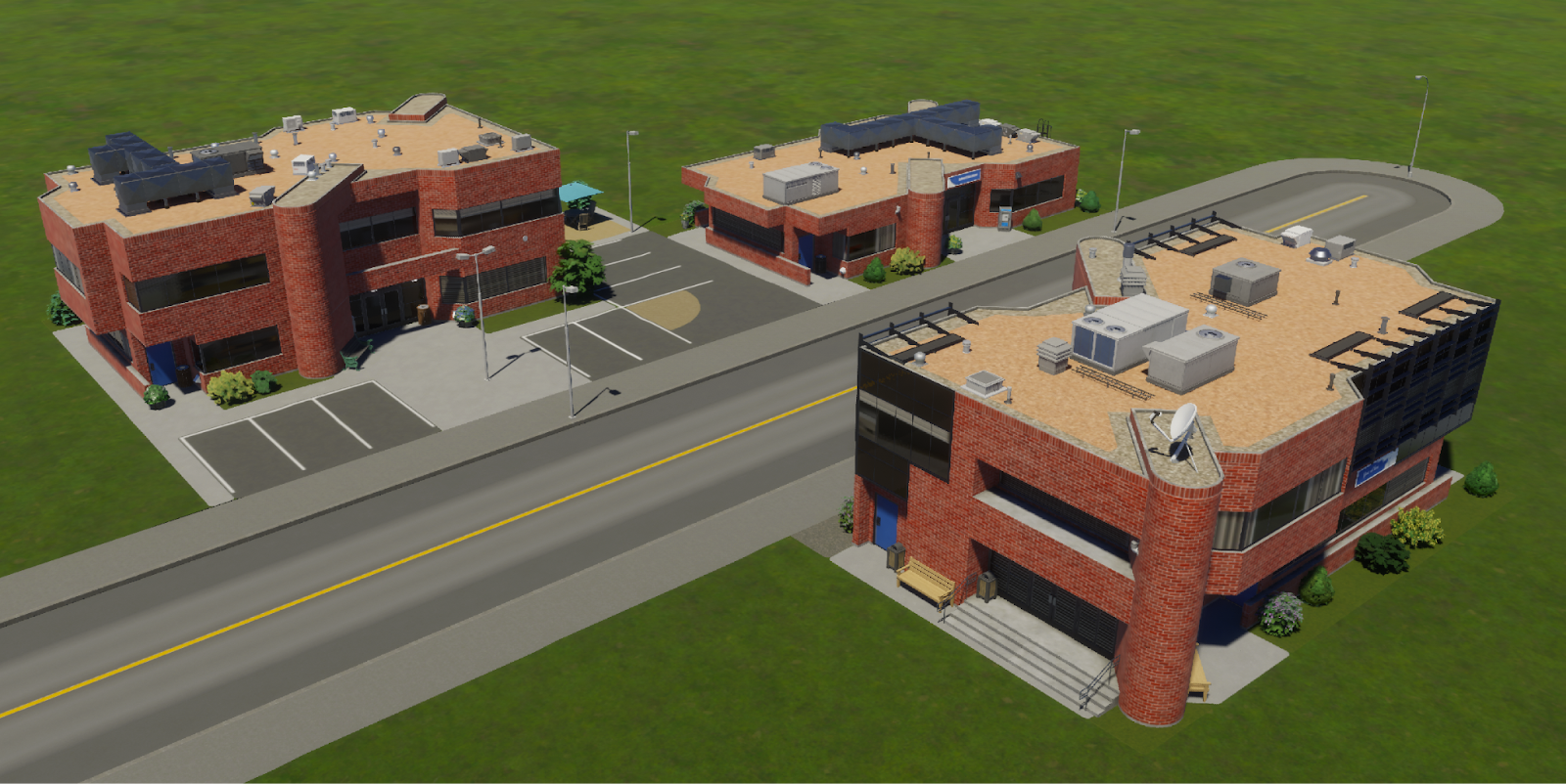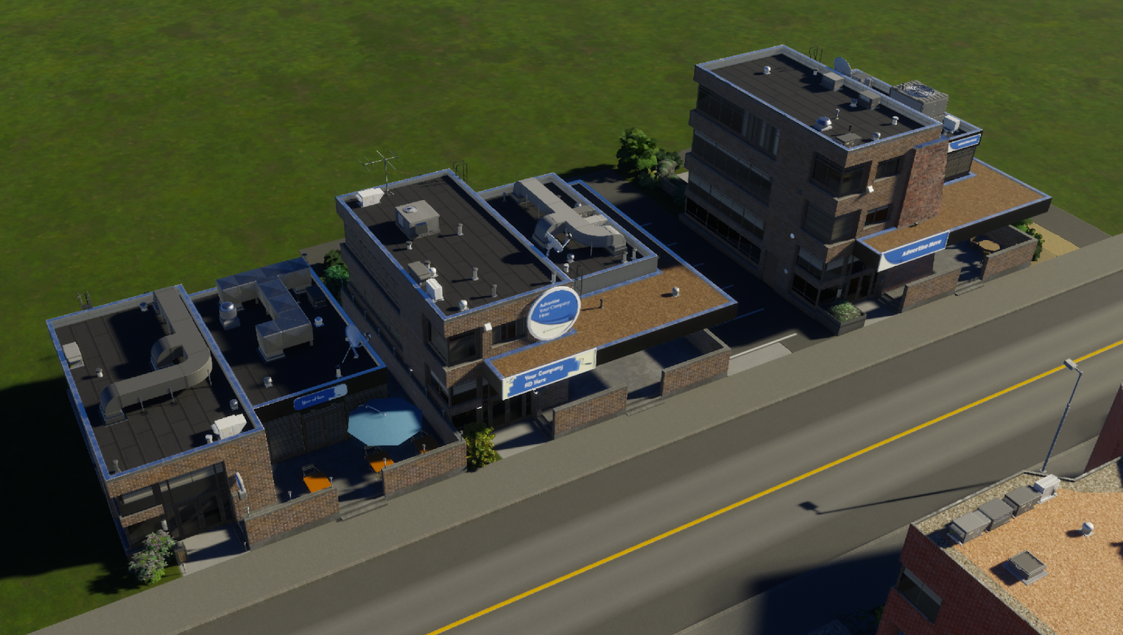The last office style in the set illustrates my approach of including subtle hints about the prestige of the building level into the propping of the asset. The pavement for the parking lot gets darker, representing that it had been surfaced recently. The lower levels have more haphazard landscaping, whereas it's much more defined in the higher levels. I tried to build in a lot of these hints to all the assets I contributed to this Region Pack.