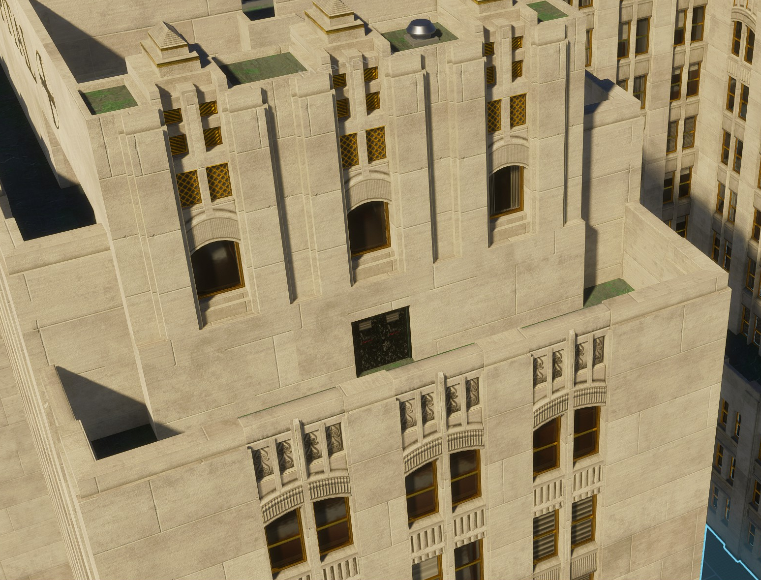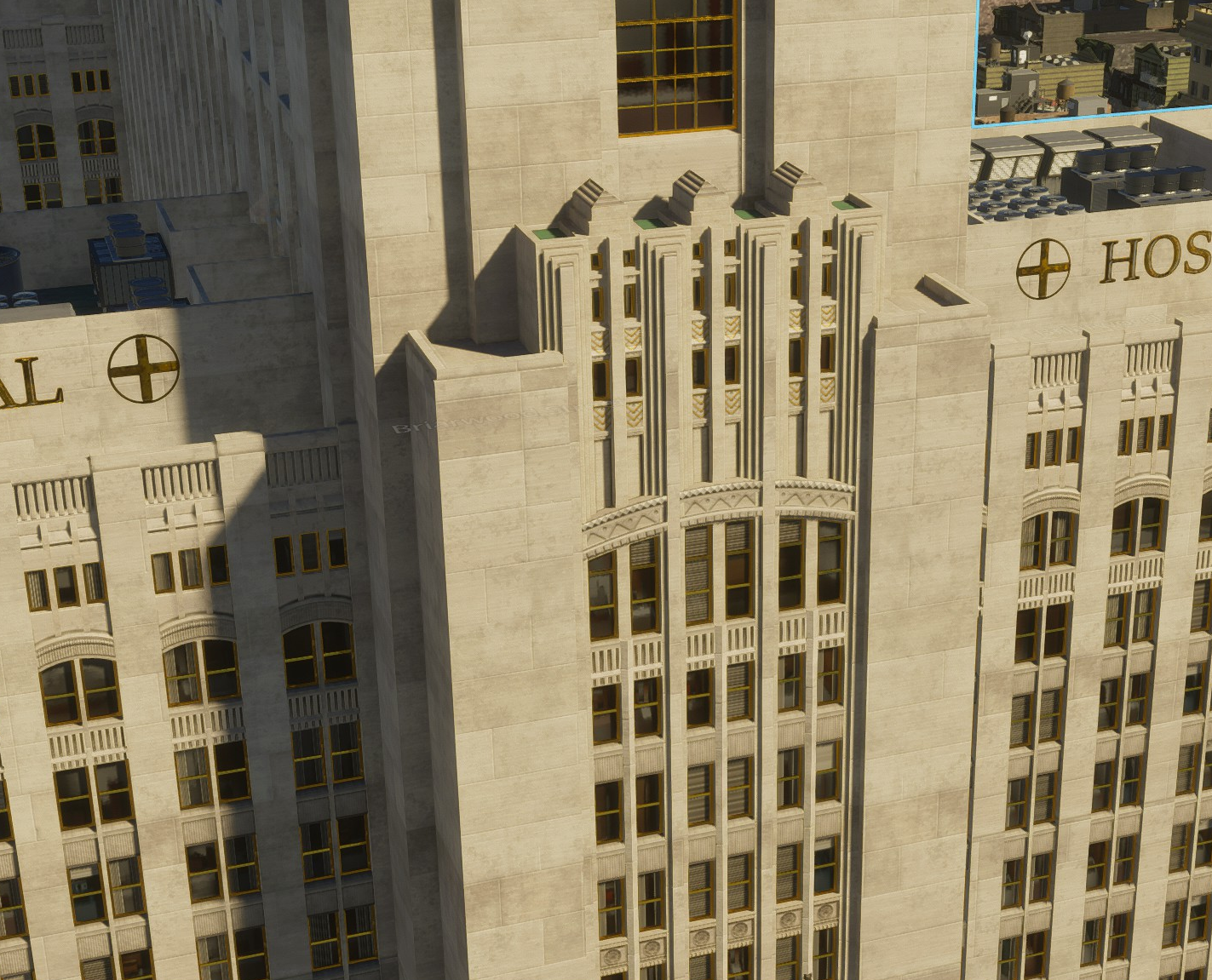 For years, I had the idea of creating my own version of the General Hospital, inspired by the Los Angeles Medical Center, but this proved quite tricky in the first Cities: Skylines. This building has a huge footprint—about 180.000 tris. When we first got the pitch for the Region Packs, I knew I wanted to include it right away. I think this building has the largest footprint of all the American Buildings. It’s a behemoth. I started modeling it out in SketchUp and textured it in Photoshop and Blender. The base material had a couple of iterations. It started off as a very rough concrete, which I made in Substance Designer, a custom material. It was only after a couple of iterations that I was happy with the overall look of the base material. This building has many Art Deco elements, so I handpainted the panels, which are also used in many Art Deco skyscrapers. All the arches have handpainted normals and textures—there are a ton of them! This took a huge amount of time, but I’m so happy with how it turned out. To further emphasize the Art Deco look I made all the windowframes and accents in a gold metal material. This can’t be done in Cities: Skylines, which further emphasizes Art Deco architecture. This building really makes use of all the PBR maps that Cities: Skylines II has to offer.