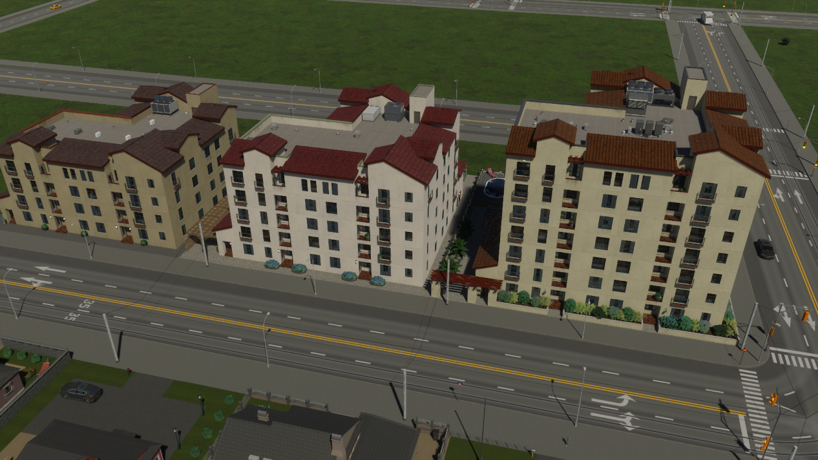 I created this large apartment complex that has pedestrian paths leading to each building set away from the main street. Achieving symmetry with the walking paths and surface areas in this asset required a lot of trial and error. 155 surface areas were used, the largest of which has 96 nodes.