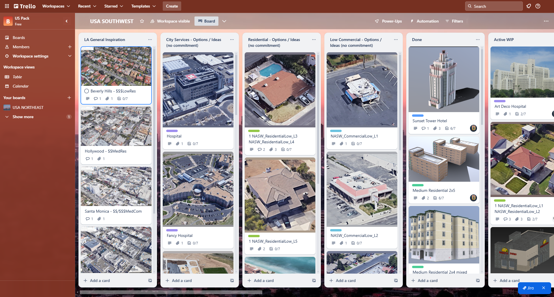 We would then add images and links of these references to a post on the board, where each of us could claim one to work on. You will recognize some of the buildings above as inspirations for what ultimately made it into the pack, while others were left for future endeavors.