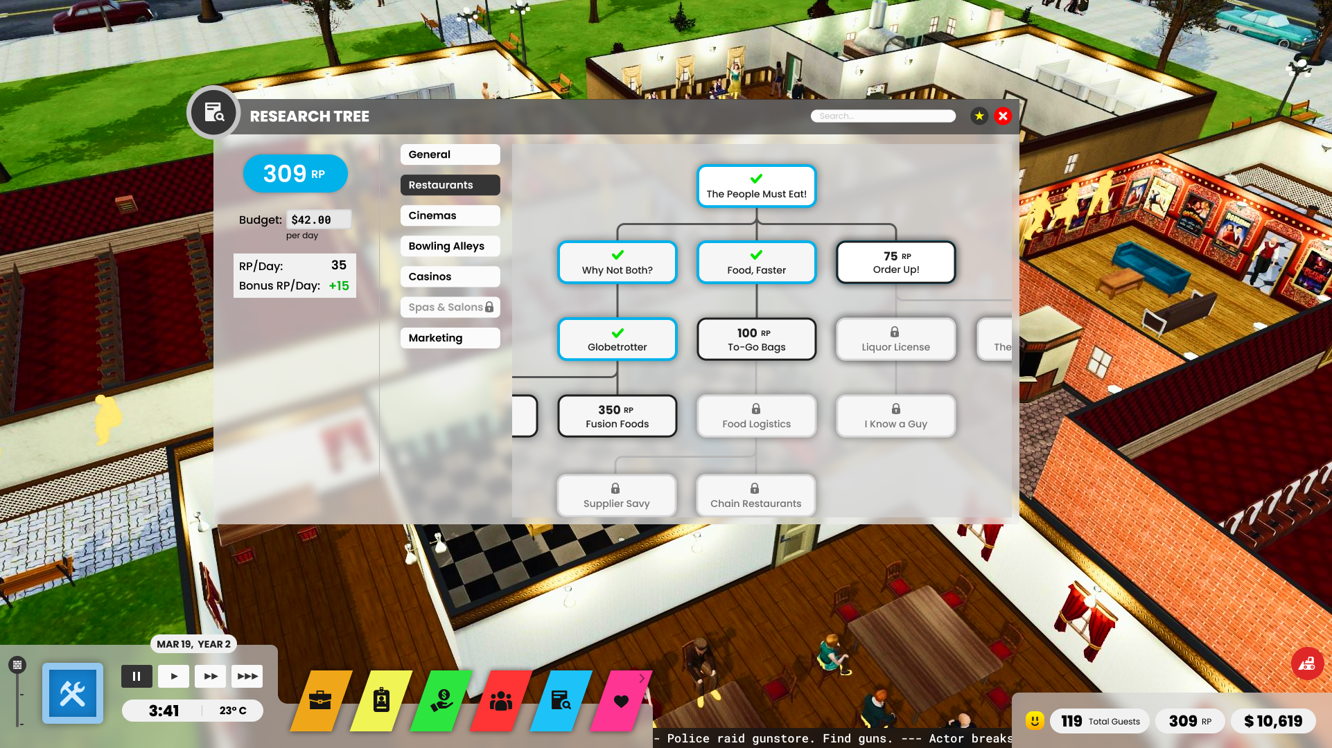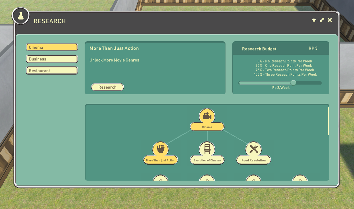 The research tree above is an excellent example of this intuitive interface design. It’s easy to tell which tech tree you’re in, which technologies are researched, what’s available to be researched, and what’s locked. With this type of design, you’ll spend less time wrestling with the interface, meaning you can spend more time on what’s essential: attracting guests and making money.
