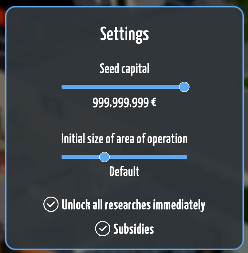 - When starting a new sandbox game, you can now choose starting money, research, subsidies and the map starting size