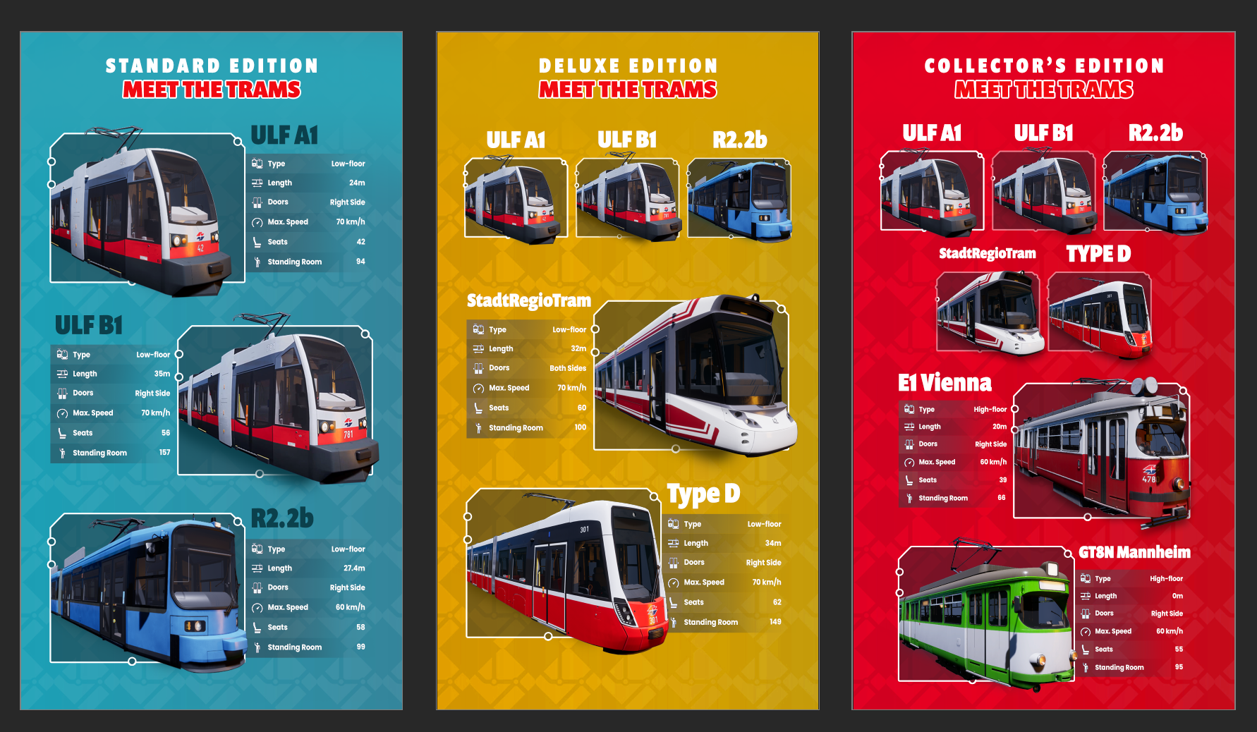 - [b]Standard Edition:[/b] Includes the [i]ULF A1, ULF B1, and R2.2b trams[/i], allowing you to dive straight into the diverse world of tram operations in the bustling city of Tramau.