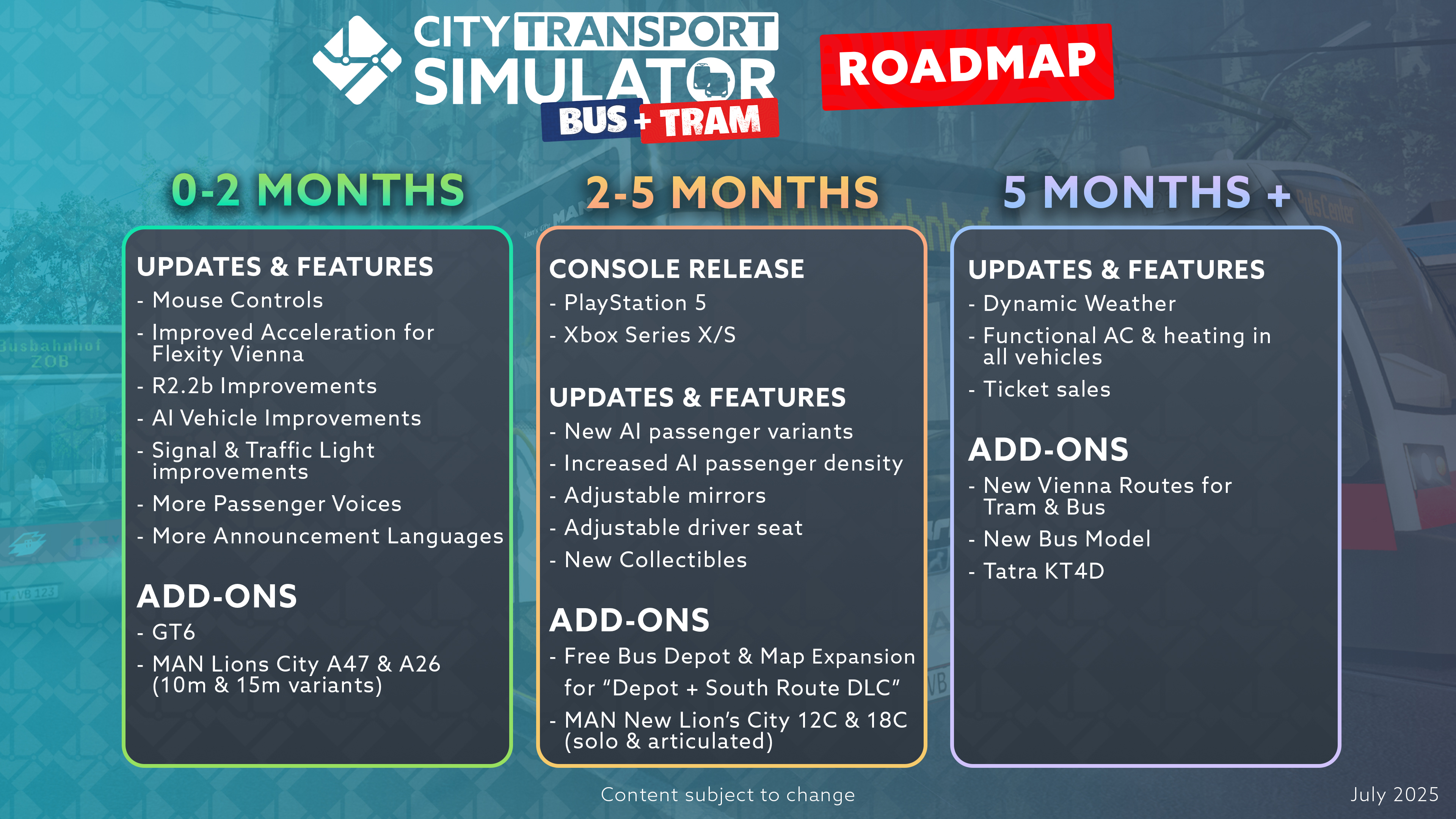 Since the release of [b]City Transport Simulator: Bus[/b], a lot has happened and we have received tons of feedback from you. Today, we are excited to finally present the new roadmap for City Transport Simulator! In the coming months, you can expect not only bug fixes and small features but also real content highlights, new vehicles, expansions, and a look into the future of CTS.