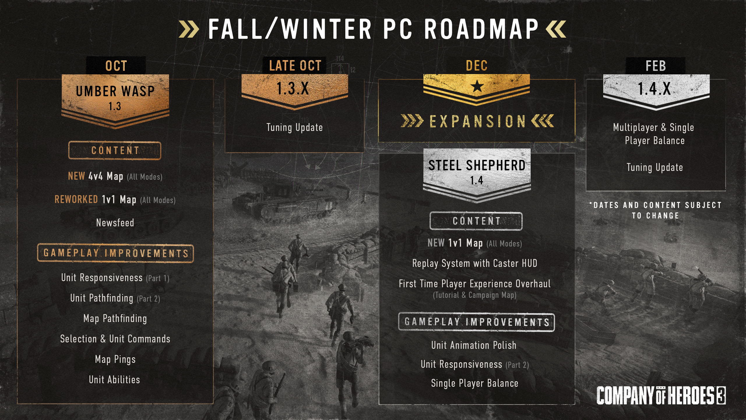 [b]Winter/Fall Roadmap 2023 for PC [/b] On August 31st we revealed our PC Roadmap for Company of Heroes 3 which covers the remainder of 2023. You can see an overview of the major updates and features we plan to implement this year in the roadmap graphic below. [url=https://coh3.companyofheroes.com/fallwinterpcroadmap]An in-depth blog post is available here[/url].