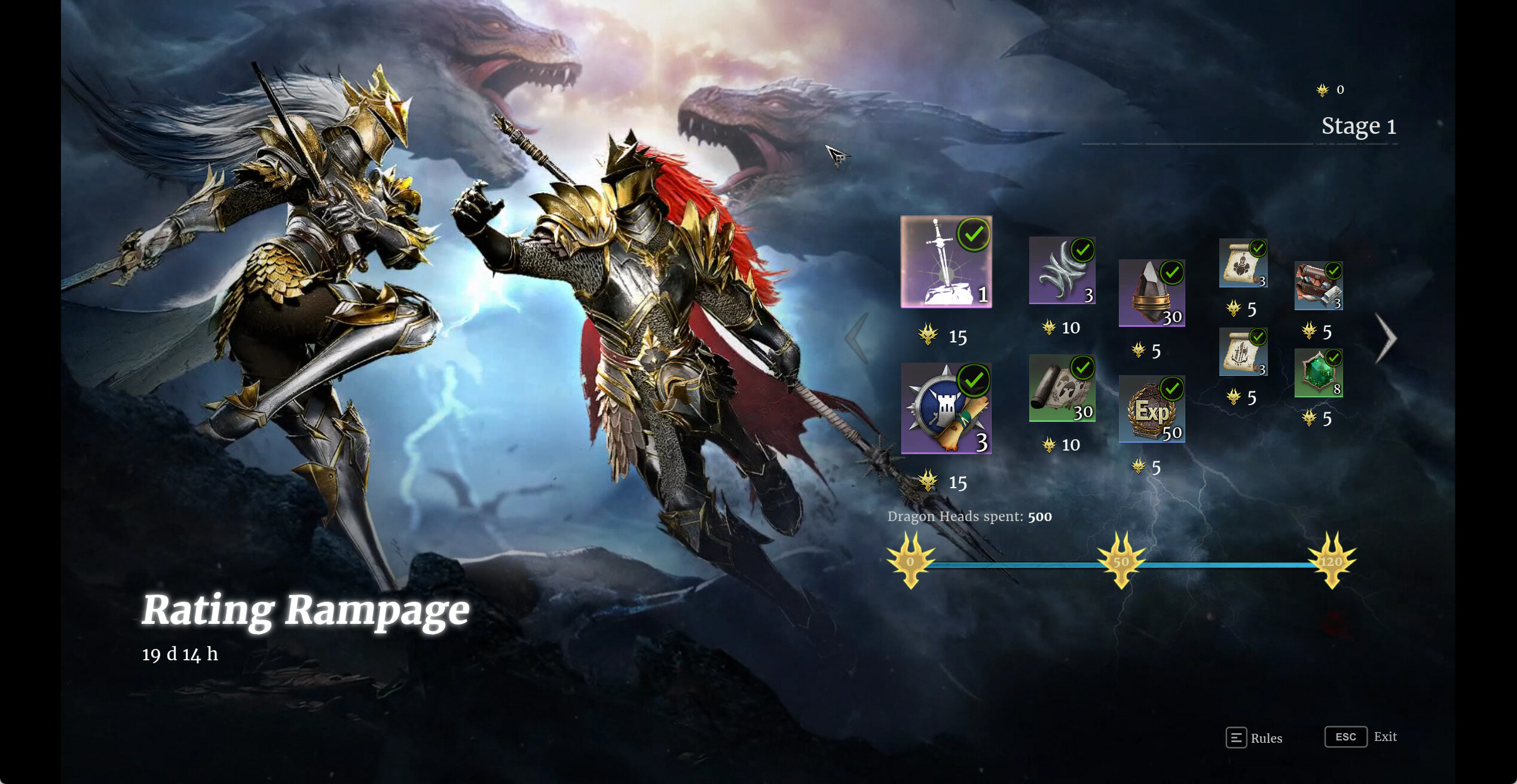 - [b]Stage 2[/b]: Spend 50 Dragon Heads to unlock Stage 2 and a host of incredible rewards like [b]Rare and Pure Wisdoms, Greater Scrolls of Glory[/b],and many more useful items.