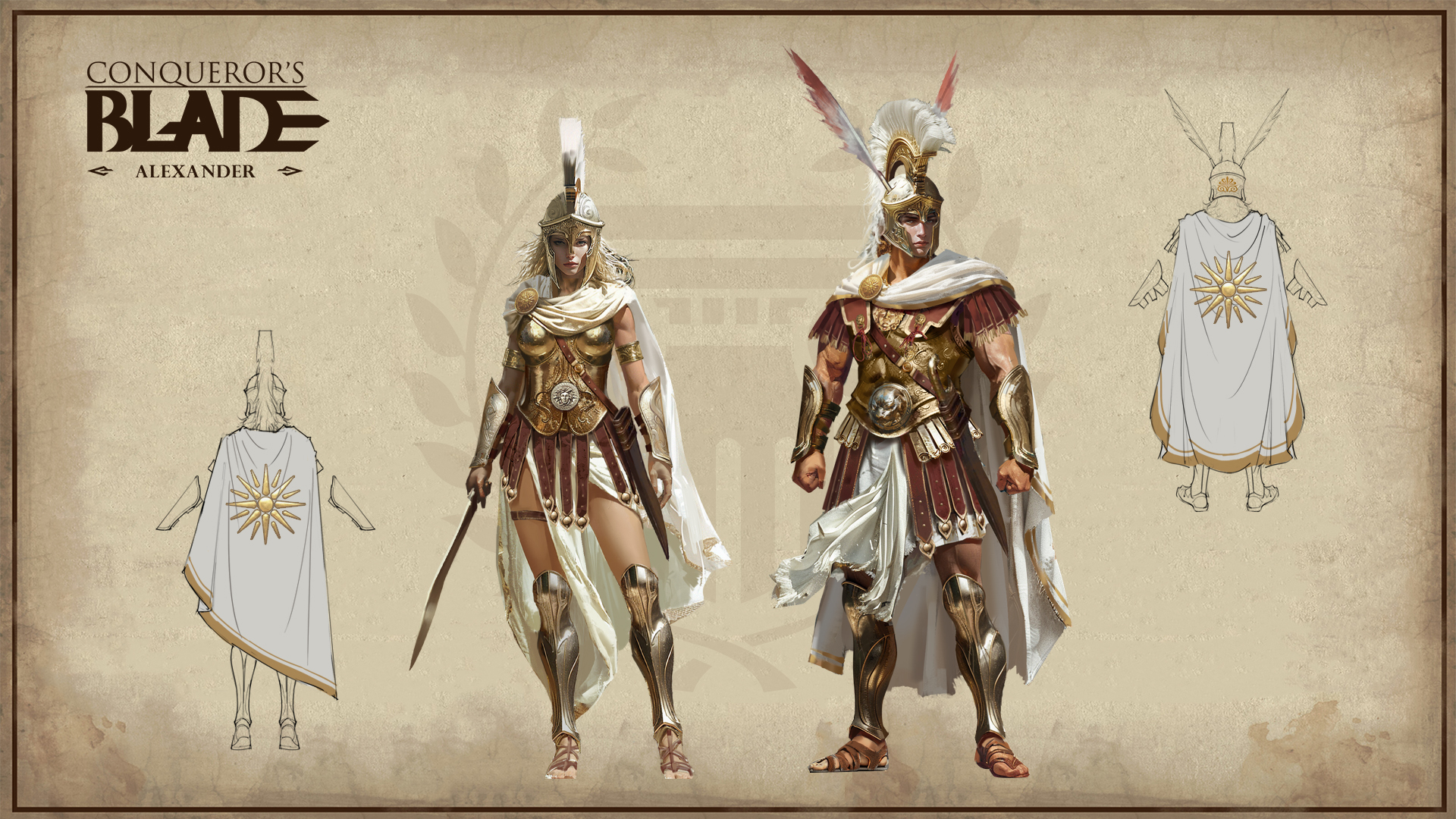 The attire incorporates the Vergina Sun emblem as a primary element on cloaks and breastplates, symbolizing the Macedonian royal family's aspiration for bountiful lands and sunlight.