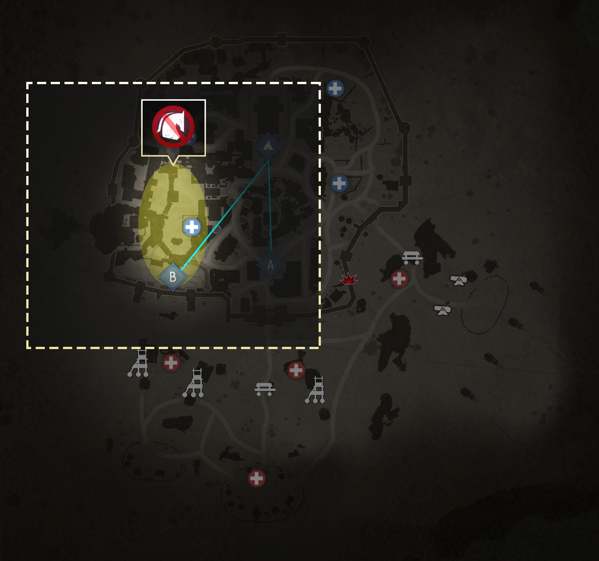[Mystara Castle] is situated in a gorge surrounded by mountains, leaving the southwest and southeast gap to resist enemies. Throughout history, attackers often focus their main attack on the lowlands to the southwest of the castle. Zip lines are particularly effective here, so defenders usually prioritize the southwestern wall for defense. Also, attackers may blast away the southeastern walls and catch the defenders off guard.