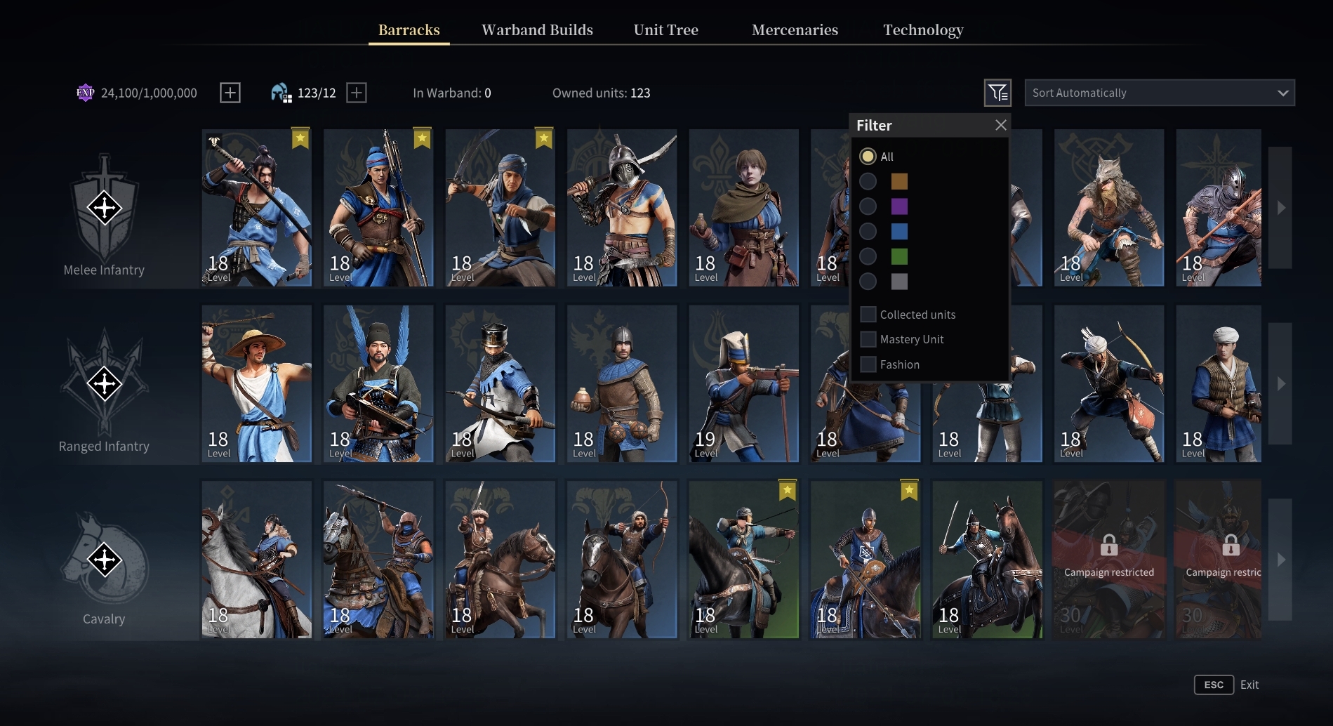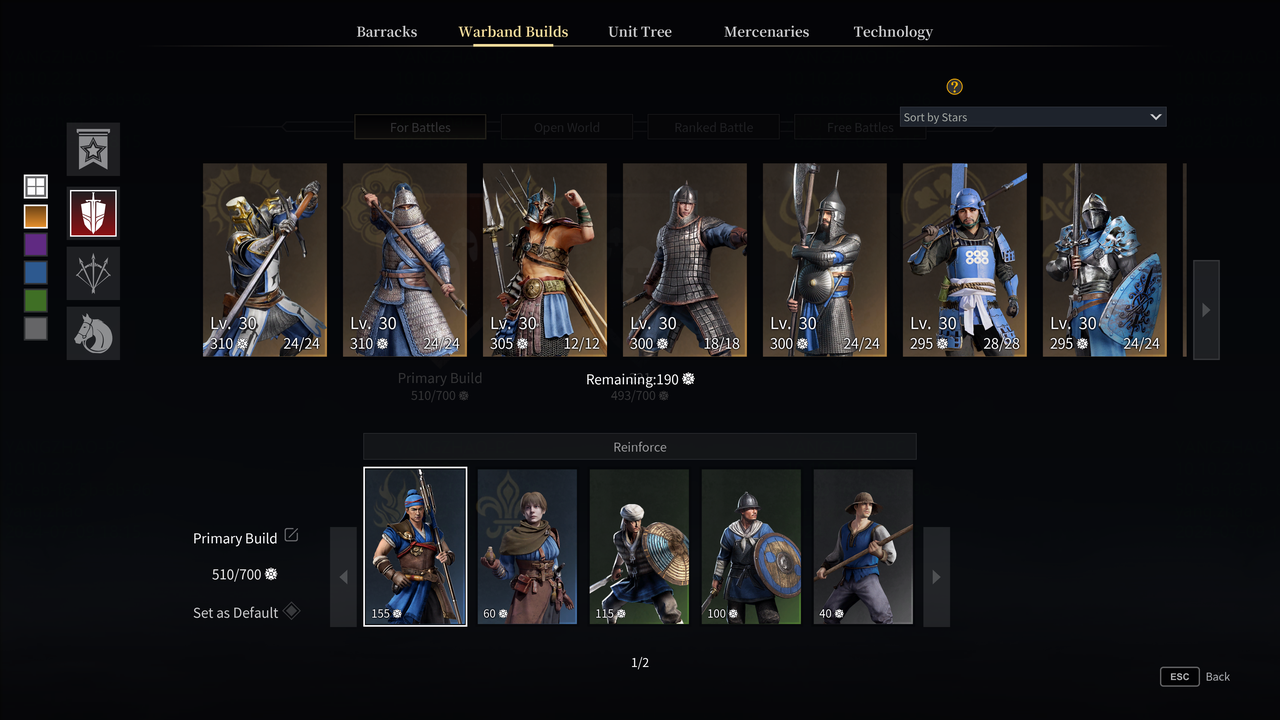 An option for filtering units by stars has been added to the [Barracks], [Warband Builds], and [Open World] interfaces. Additional filtering options for Mastery, Attire equipped Units, and Main Units have been added to the [Barracks] page.