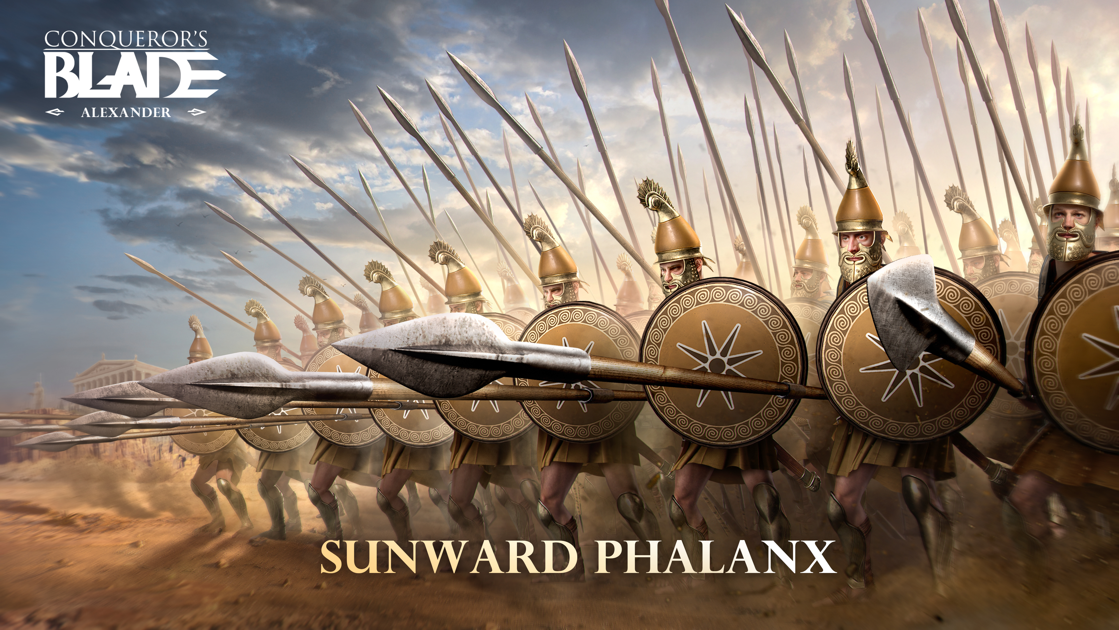 Wearing the iconic style helmets, linen cuirasses, and leather kilts, the finest warriors of Macedonia wielded spears of extraordinary length, their arms secured by large round shields, advancing in an indomitable phalanx formation. Shielded by their round shields, they stood fearless against attacks from afar. Following the king's command, moving steadily back and forth with their long spears, continuously compressing the enemy's lines. Through skillful manipulation of the distance from the enemy, Macedonia could evade harm while seizing the opportune moment and launch a lethal strike on the ever-changing battlefield! Unbeatable like a mountain, march alongside the Sunward Phalanx, sweeping across the world in "Conqueror's Blade"! It's the ultimate battle, the pursuit of ideals! For more information about the new season and new units, please follow our official community.