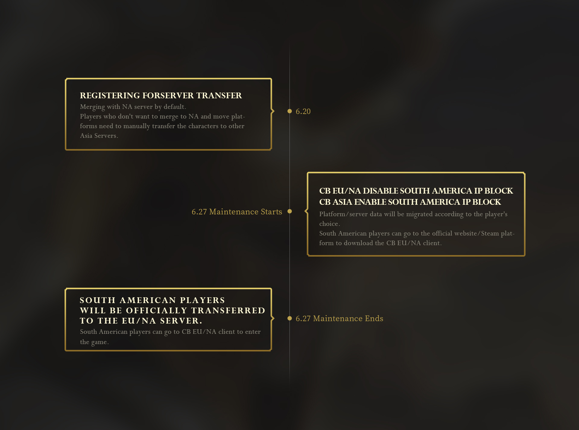 - Characters for which no selection is made during this time will be transferred to the NA [Eagle Range] server and be part of forming the [Elysium Peak] server.