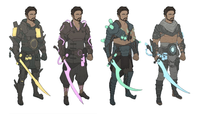 Here's a small gift for you. One of a few concepts we'll showcase on the Kickstarter page. The following one is showing 4 different variants of the character attire.