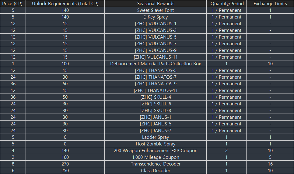 - Unused CP, CP Special Boxes, Special Transcendence Weapon Boxes, Gold Weapon Selection Boxes, [ZHC] Daily Selection Boxes, Daily Class Selection Boxes, Daily Weapon Selection Boxes, and Halloween Baskets of Candy will be removed when the event ends.