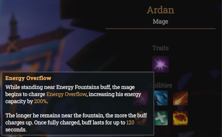 Each hero now comes with a unique trait tailored to their class. In the Demo, this is available for the Mage, Ardan. You can now experience his Energy Overflow trait: locate an Energy Fountain on the map, stand inside it, and charge up the buff to its full duration.
