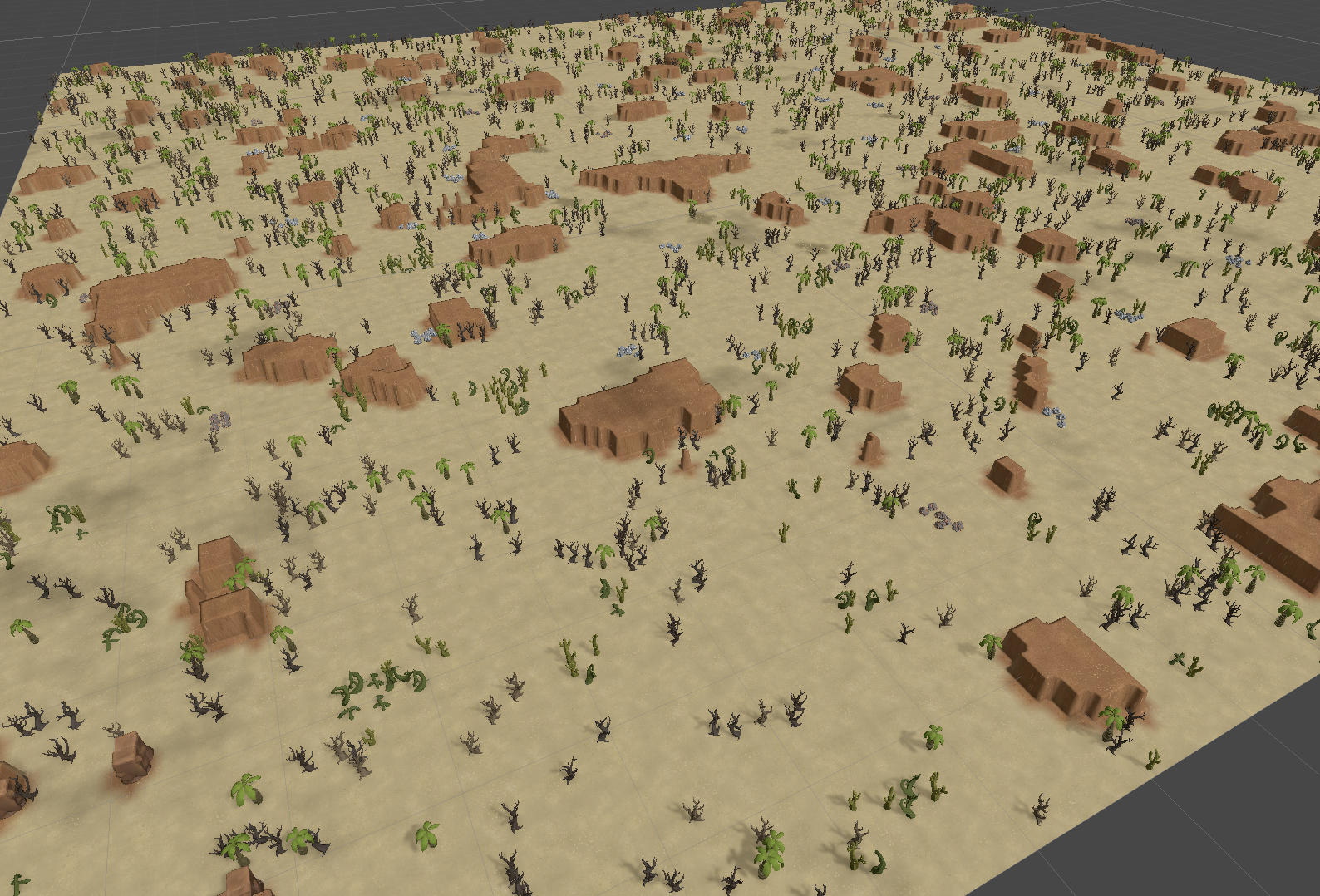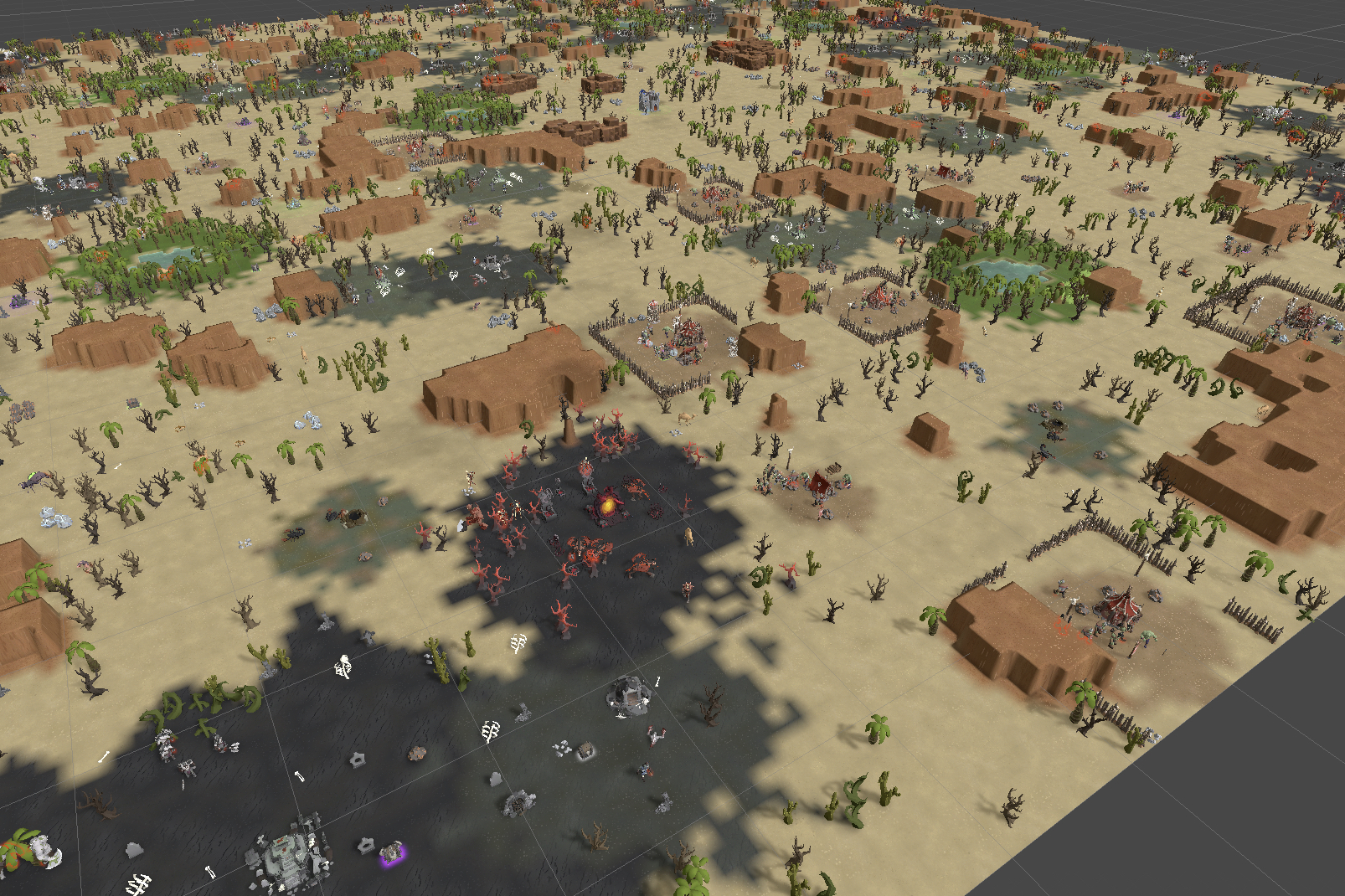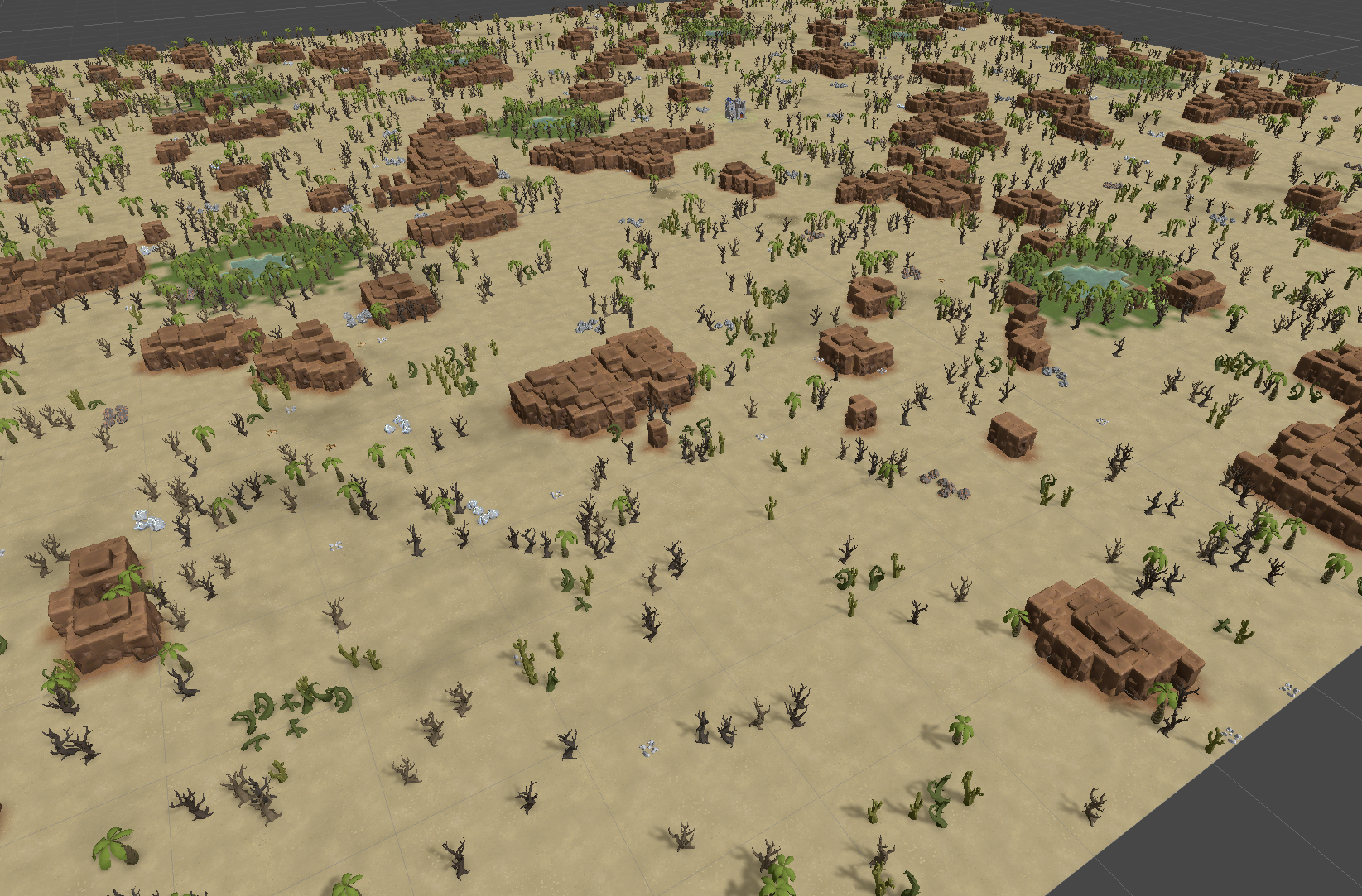 Even in the harshest of deserts, life finds a way. Trees, stone, and iron veins emerge, waiting to be claimed.