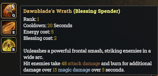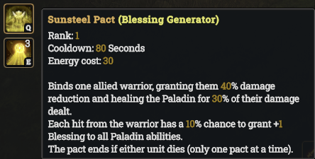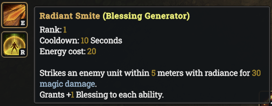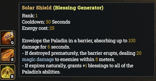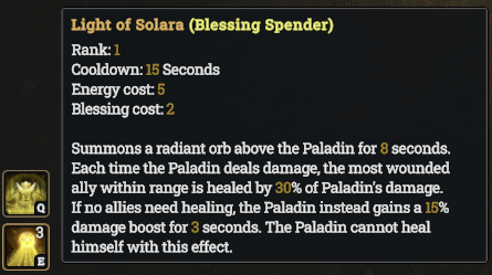 The Paladin draws upon Blessings, a unique resource with a maximum of three at a time. His abilities fall into two sacred categories:- [b]Blessing Generators[/b] - grant divine charges.