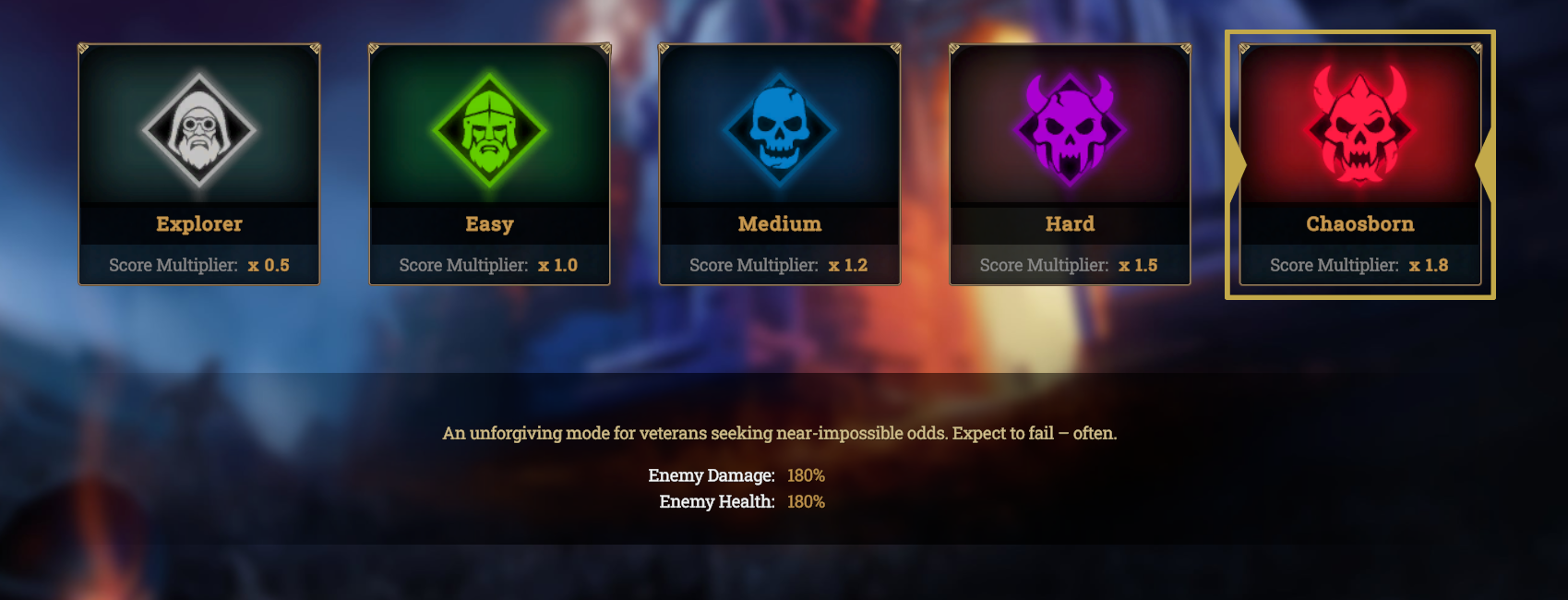 - If you prefer an easier path, Explorer is the right choice for you. If you already know the game mechanics and enjoy a high challenge, Chaosborn is the difficulty for you.