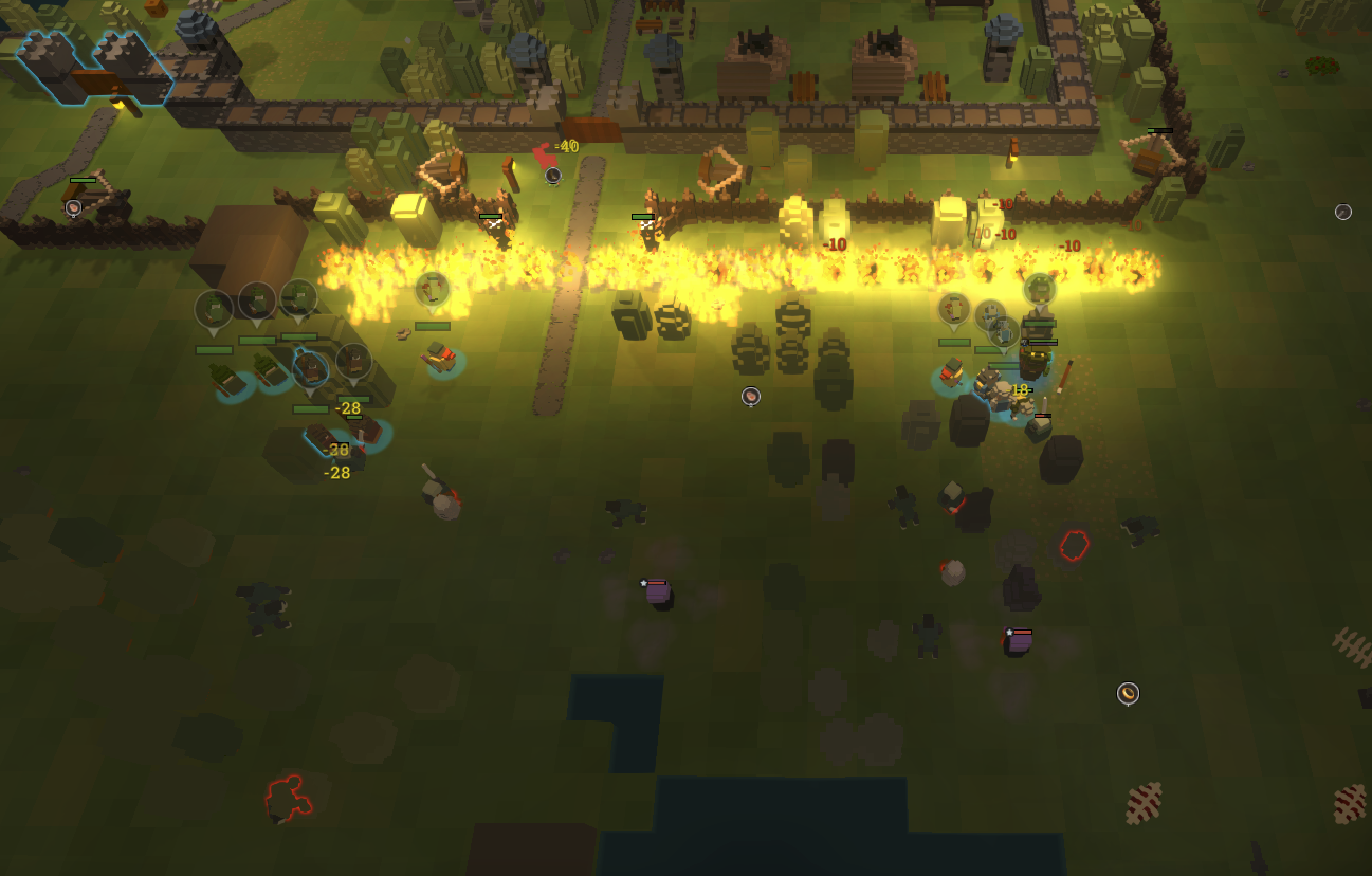 In Darfall, each tile and object has a flammable level, which determines how quickly fire can spread to that tile if there is already a fire nearby. For example, grass tile has a flammable level of 1, while in the desert, it may be just 0.5, preventing the spread of fire on sand.