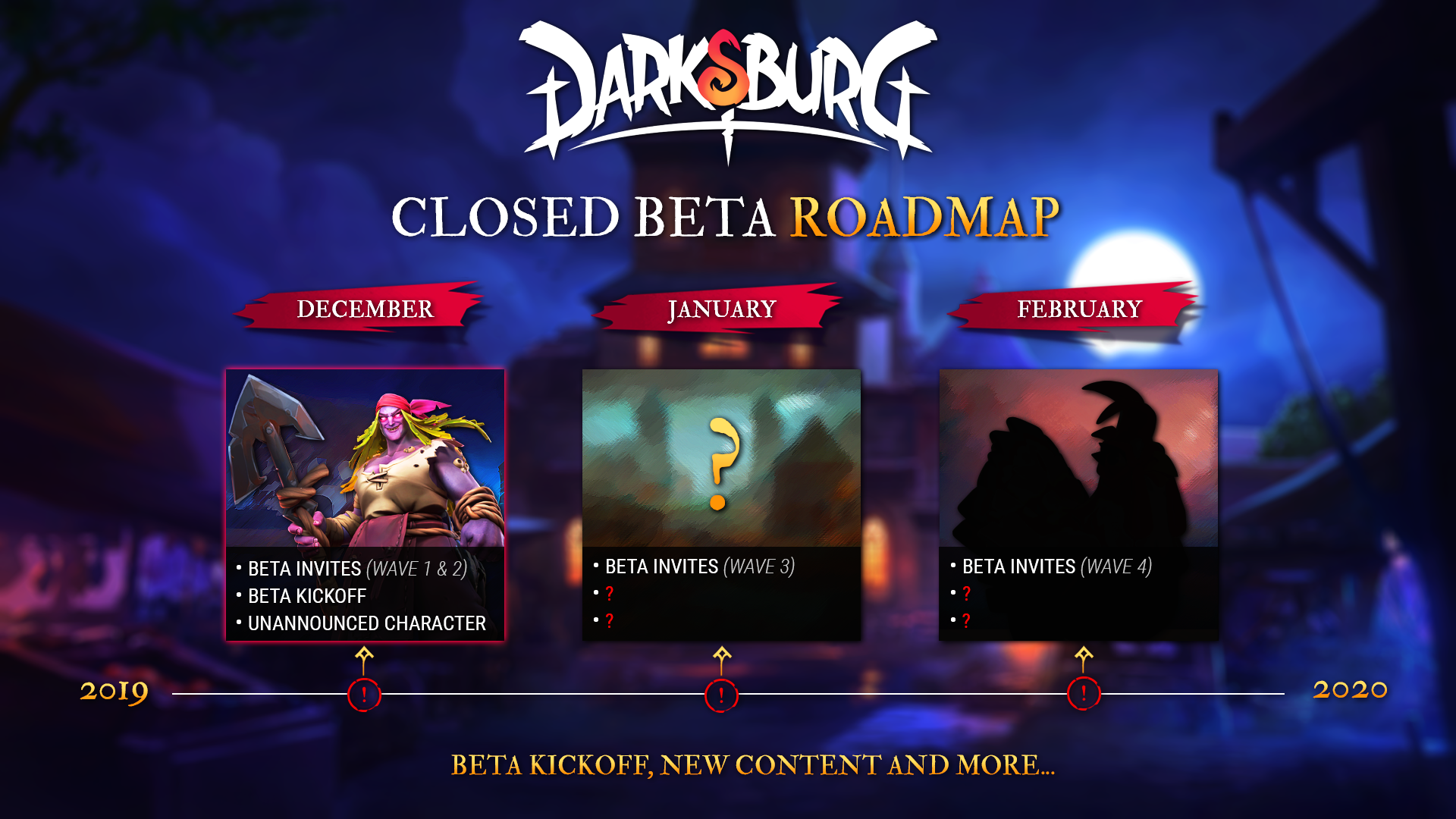 If you haven’t yet received an invite, fret not, we will be inviting people in waves over the next couple of months with the intention of eventually inviting everyone who has applied to participate. The goal of this [b]CLOSED BETA[/b] is to work alongside you all to identify key issues, improve core gameplay, test online functionality and refine the overall Darksburg experience ready for its release in [b]February 2020. [/b]