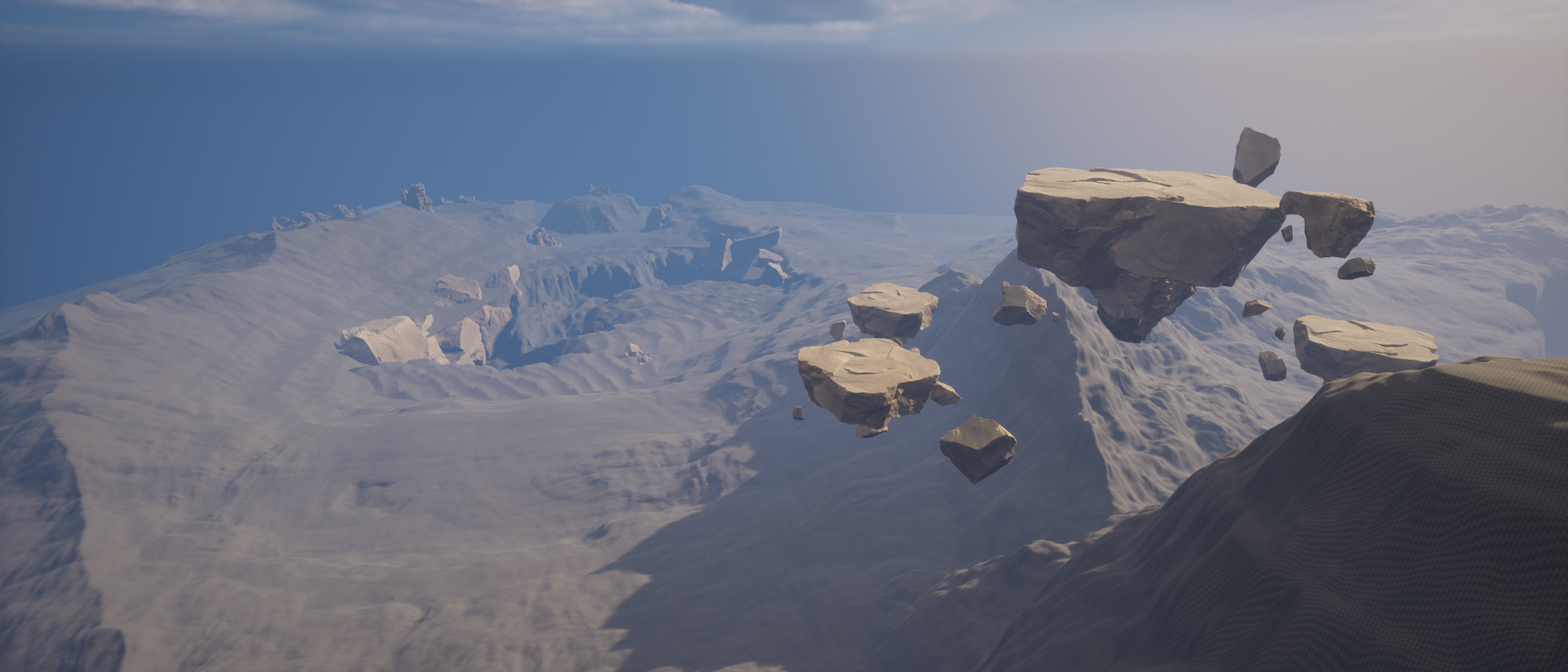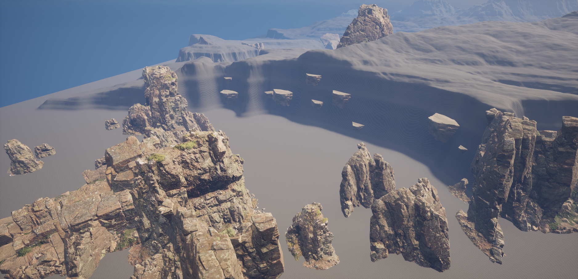 Our Level Designer, Zaicho is now moving on to blocking out the points of interests and large landmarks of the different biomes. Once the areas have been blocked out, he will go back and rebuild the landmarks and add detail to the overall environment. We are very excited to see this massive landscape coming to life.