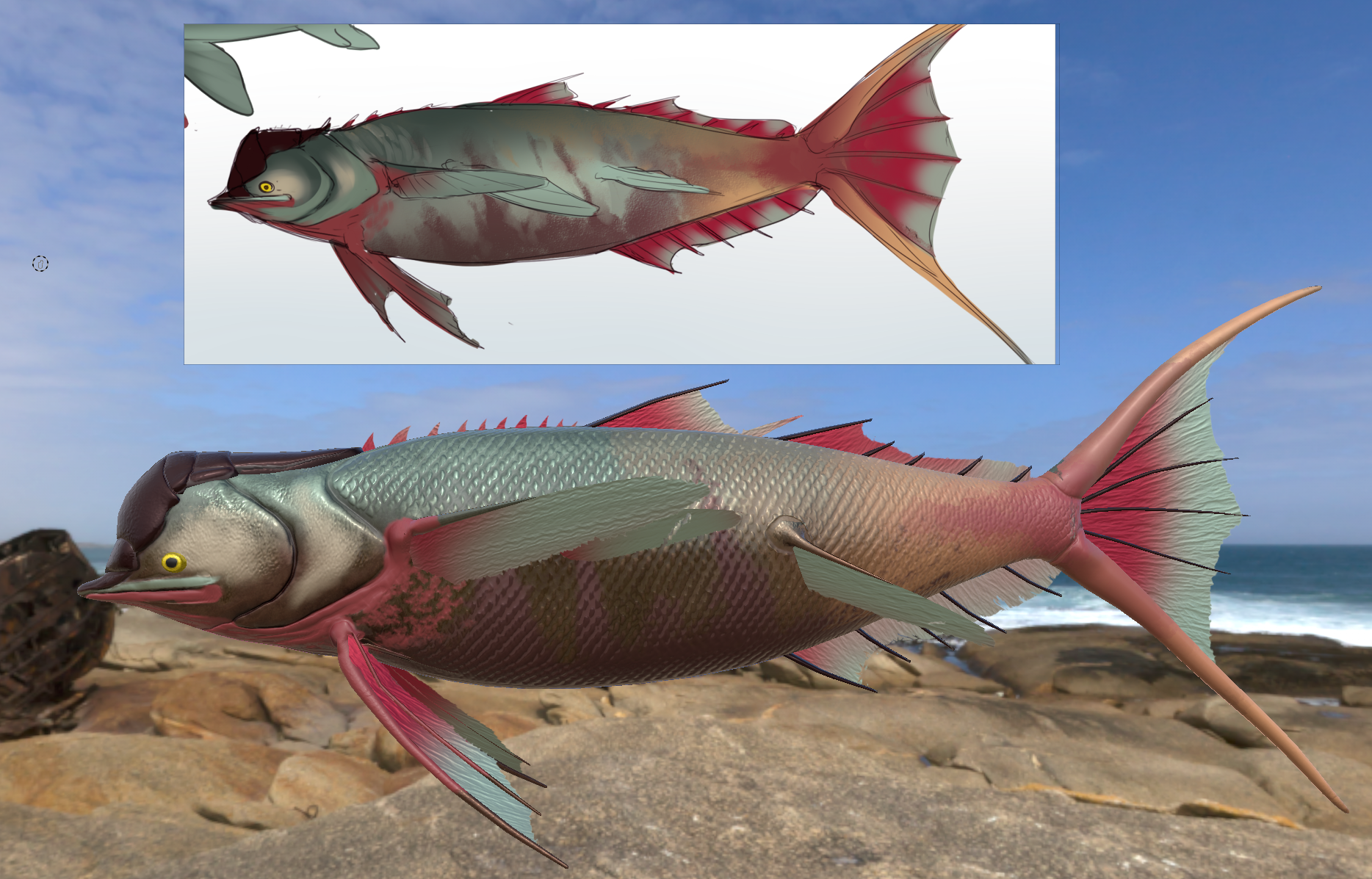 With the large ocean waters of the mega map, one fish will not be enough. Our Concept Artist, Xilev, designed an oceanic species of fish and our Environmental Asset Artist, Brigade, created its model. This new fish species is inspired by real life salmon, tuna, and dolphin fish. It will be found in the coastal waters that boarder the continent and will be the main food source of the Singe Crest.