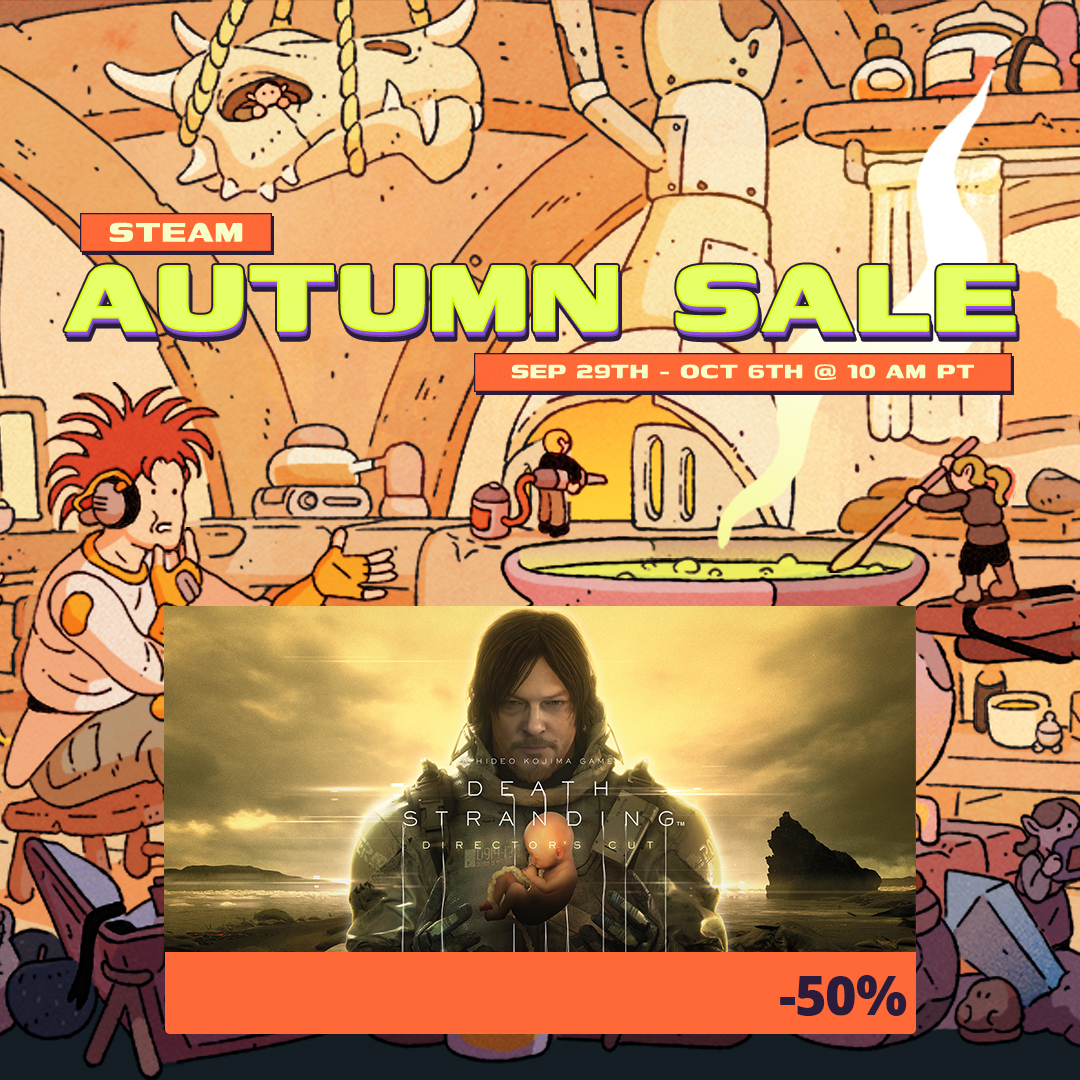 Porters! If you've not joined the DEATH STRANDING community yet, now is the perfect time! Enjoy 50% off DEATH STRANDING DIRECTOR'S CUT for a limited time as part of the Steam Autumn Sale. What's more, if you already own the base game, you can take advantage of this discount when purchasing the upgrade to DEATH STRANDING DIRECTOR'S CUT. Offer ends October 6th, 2025. https://store.steampowered.com/app/1850570/DEATH_STRANDING_DIRECTORS_CUT/