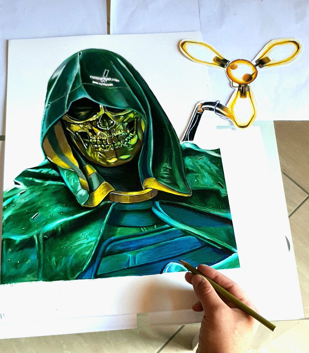 [i]During the first stage, I make simple pencil sketches of the drawing I want to make, limiting myself to the guiding lines and outlines of the basic shapes. Once the sketch is complete, I try to refine it by shaping it, adding details, colors and shading to create a more realistic and three-dimensional representation of the object or character. It usually takes me somewhere between 15 to 20 hours to complete an A3 drawing. My source of inspiration is always video games! [/i]