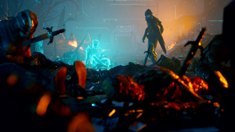 The second screenshot is a scene in which Anna spots the essence of Therone, another of the playable characters. In Deathbound, an extremely important part of the game is capturing the essences of fallen warriors and building a party to help you survive in a tech-medieval world tarnished by the gruesome conflict between Church of Death and Cult to Life.