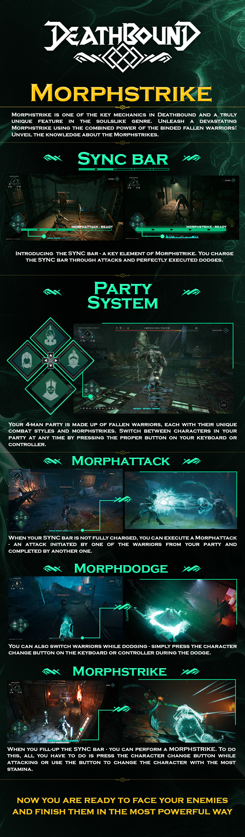 Today, we would like to tell you more about one of the [b]key mechanics[/b] in Deathbound. [b]Morphstrike [/b]is a powerful attack created from the combined forces of fallen warriors in your party. The Deathbound demo is now available again, so below, we will explain everything about this devastating attack and one of the most crucial mechanics in the game.