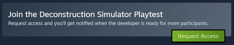 This is the first very important event in the production of our game, so we hope that you will be happy to join and be a part of the upcoming Playtest. ????[b]We have a step-by-step guide for you on how to sign up for the upcoming Playtests ????[/b] 1. Login to your Steam account 2. Go to the [url=https://store.steampowered.com/app/2487150/Deconstruction_Simulator/]Deconstruction Simulator Steam page[/url] 3. Scroll a little lower on the page 4. You will see the banner like below ???? and click the green button "[b]Request Access[/b]"