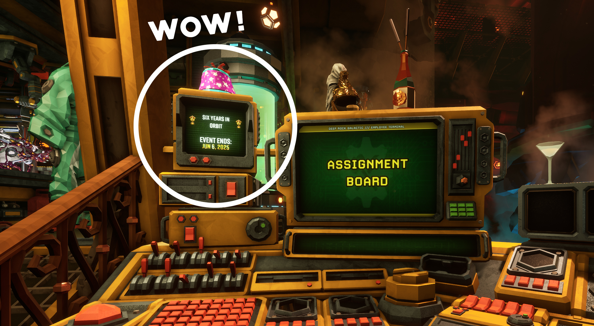 A good party requires party hats. And a party hat requires an assignment, because Deep Rock Galactic is a business, not a charity. Complete the [b]Anniversary Bonus[/b] assignment, and you’ll unlock the delightfully wobbly [b]Party Hat - Year Six[/b] balloon top hat. As with all our anniversary hats, this one is a rare time-limited opportunity.
