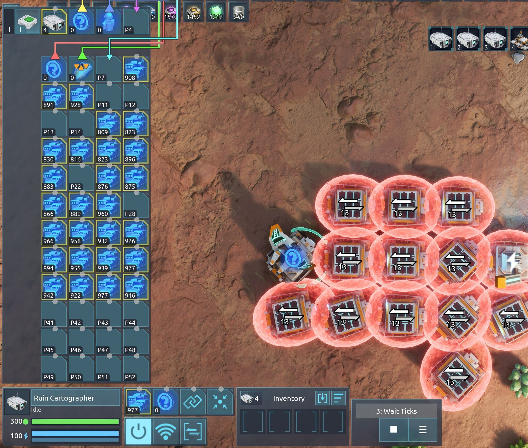 With independent ruin solving scripts, you'll soon run into your ruin solvers end up all in scouting mode around your base, rendering them useless. Wouldn't it be more useful to have a central register of found ruins, instead of each ruin solver wandering around blindly? Here, the "Ruin Cartographer" unit comes into play - it continously scans its surroundings for new ruins, signalling them to a group of ruin solvers. The ruin solvers then individually allocate a ruin each, solving it.How it's done