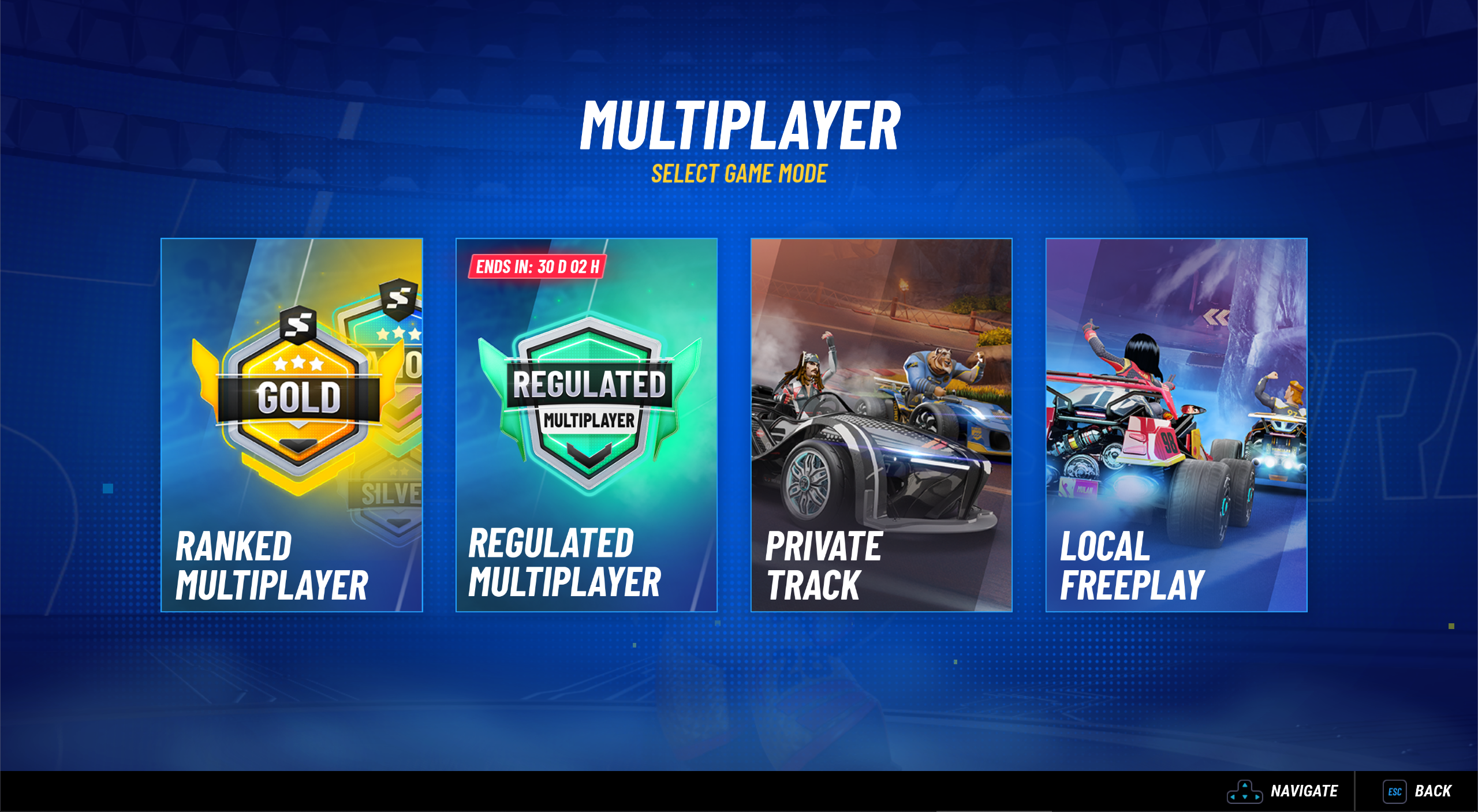 • This menu will contain the Ranked Multiplayer, Regulated Multiplayer, Private Track & Local Freeplay game modes.