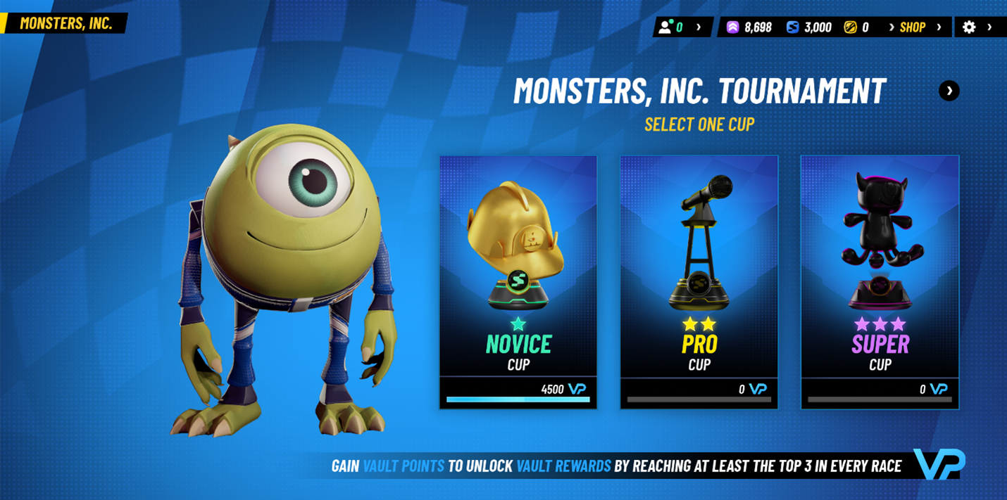 In a Tournament, each Racer from that Season has a set of Racer Tournaments. Each Racer Tournament will consist of four races for each of three difficulty-based Cups. Players can play any tournament for the Racers they have unlocked. For example, if players have Racer Mike Wazowski unlocked, they can start racing in his specific Racer Tournaments inside the Monsters, Inc. Tournaments.