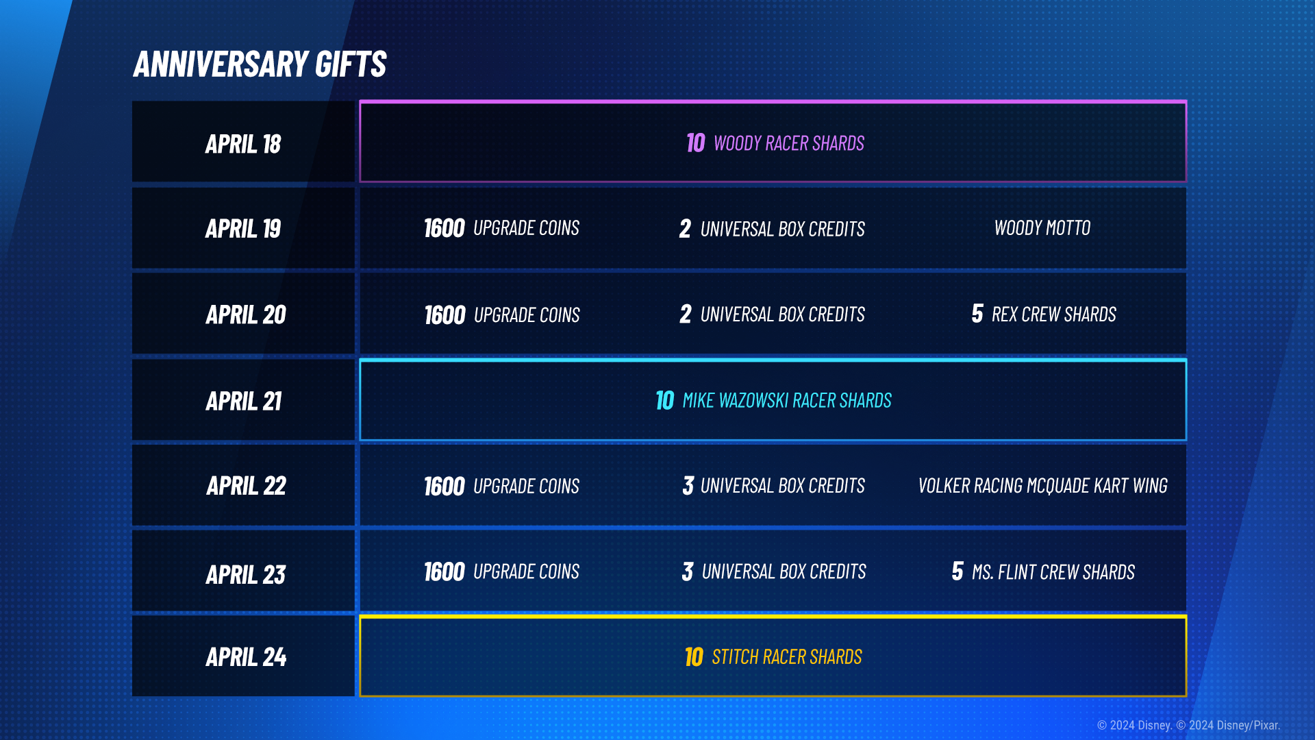 Sweet news! Season 7 brings the highly-requested new “Sugar Rush” season inspired by Disney’s [i]Wreck-It Ralph[/i], just in time for Disney Speedstorm’s one-year anniversary! The update is available now, alongside celebratory daily login gifts. Starting today and running until April 24, players can sign-in to Disney Speedstorm to receive exciting rewards including Racer unlocks, Crew Shards, Universal Box Credits, cosmetics and Upgrade Coins. So, make sure to log in every day to continue the reward streak!