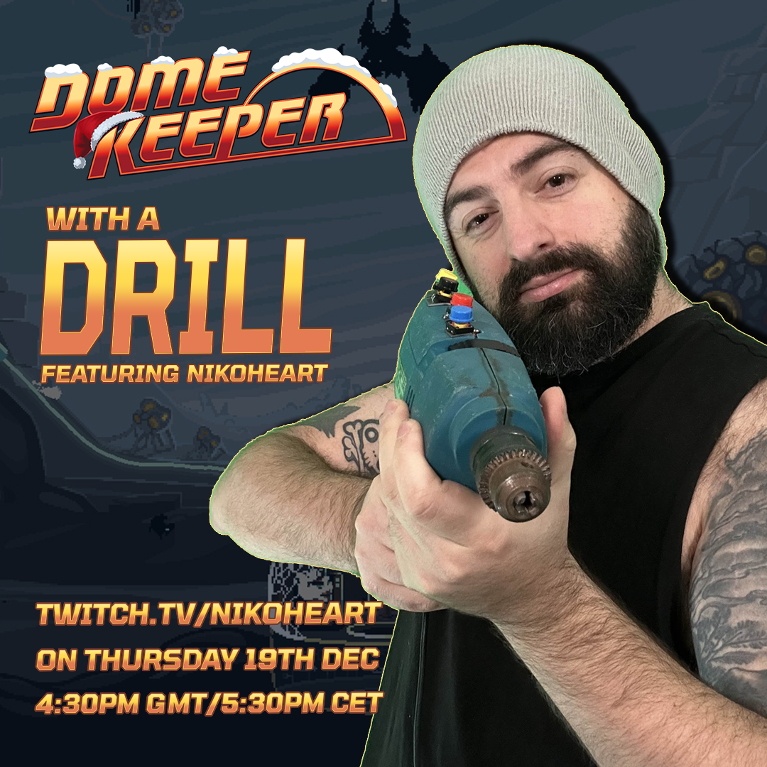 ????On [b]Thursday, December 19th at 4:30 PM GMT / 5:30 PM CET,[/b] the incredible [i]Nikoheart[/i] will be hosting a unique stream on his [url=https://twitch.tv/nikoheart]Twitch channel.[/url] We challenged him to play Dome Keeper [b]with a drill[/b], and he’s only gone and figured out a way to do it!