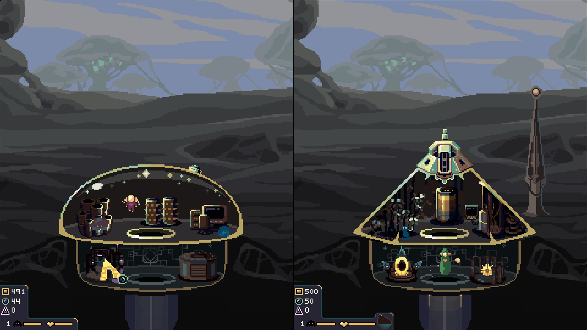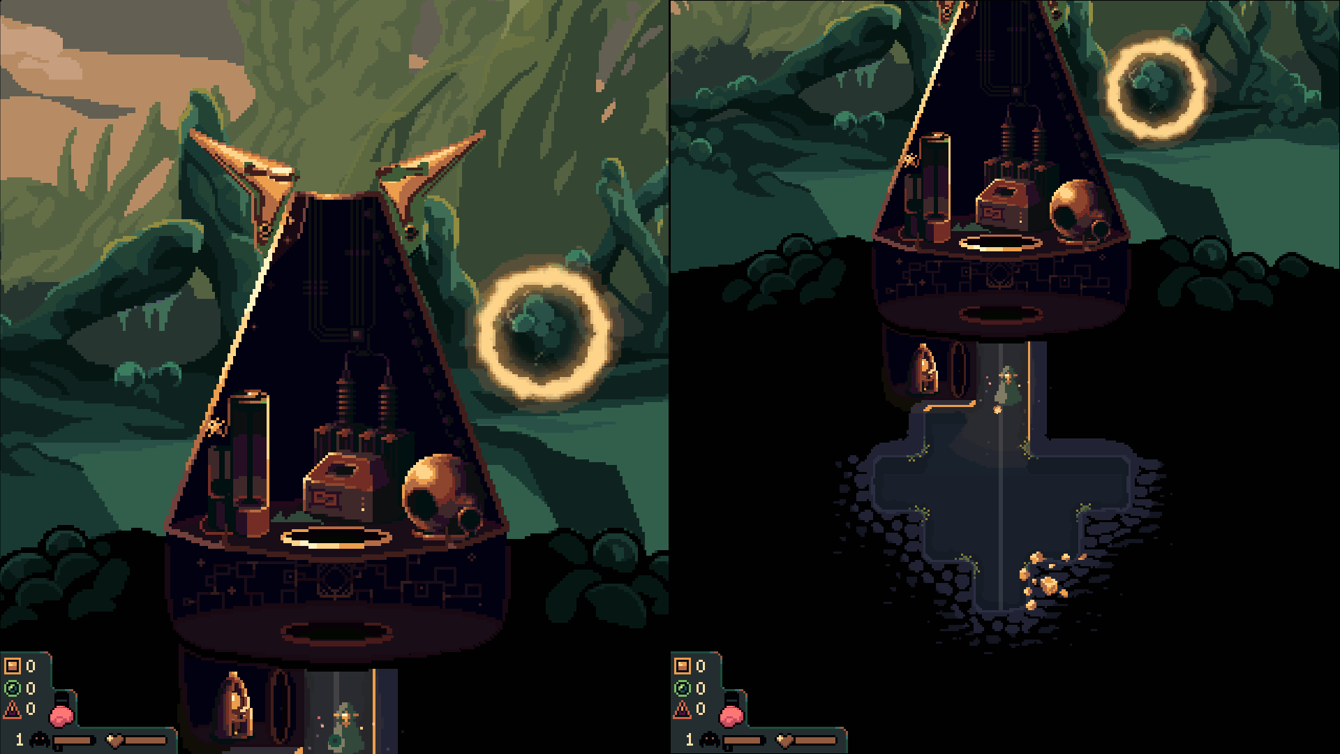 So Dome Keeper will release multiplayer with a local splitscreen feature but also with online multiplayer. You can even combine that freely, like playing as two people on one machine in splitscreen with a third friend half a world away, as a 3 person team.