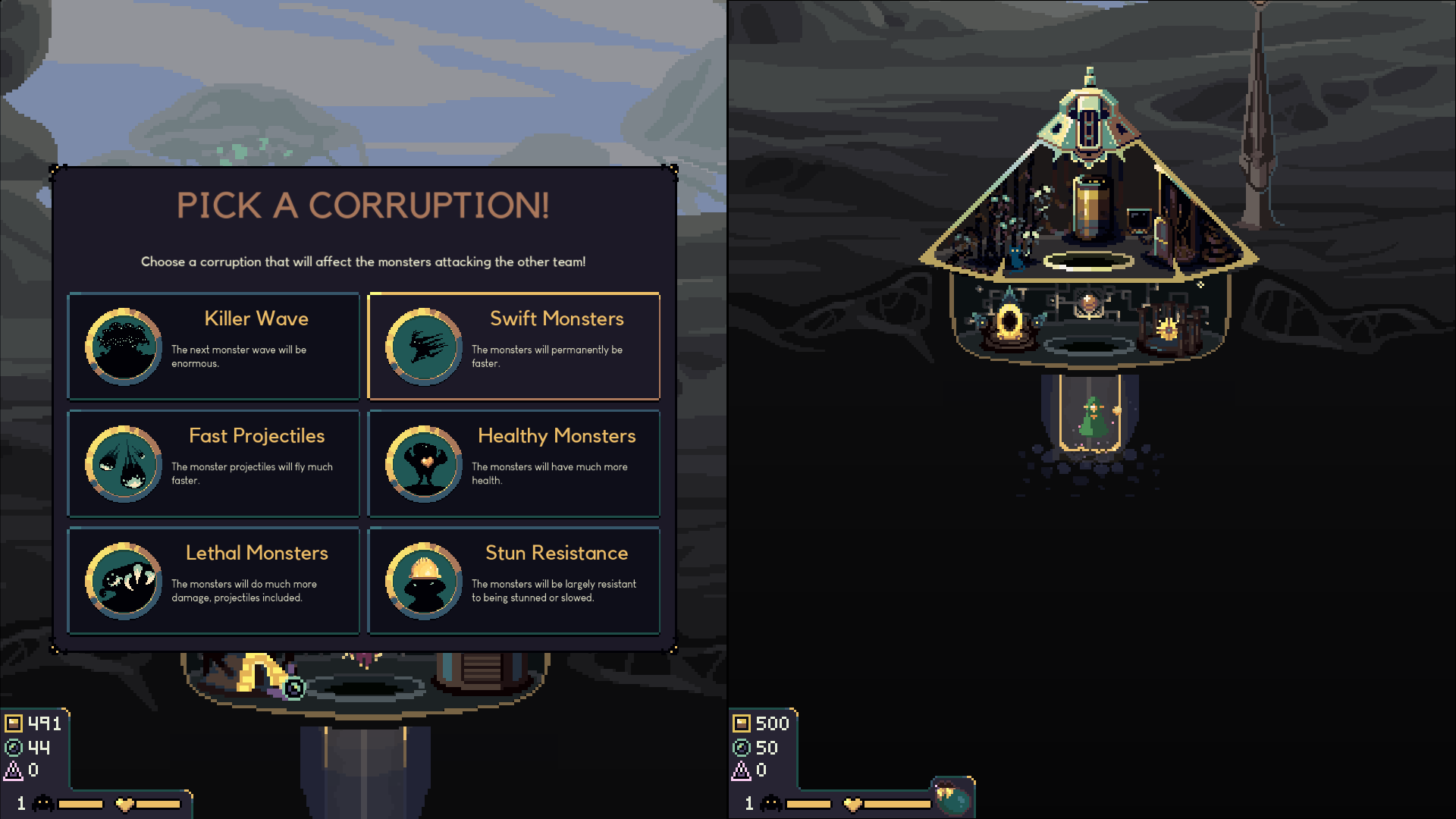 The second is to unearth a relic, bring it back to the dome and choose a corruption which is a strong and permanent buff to the monsters that attack the other team.