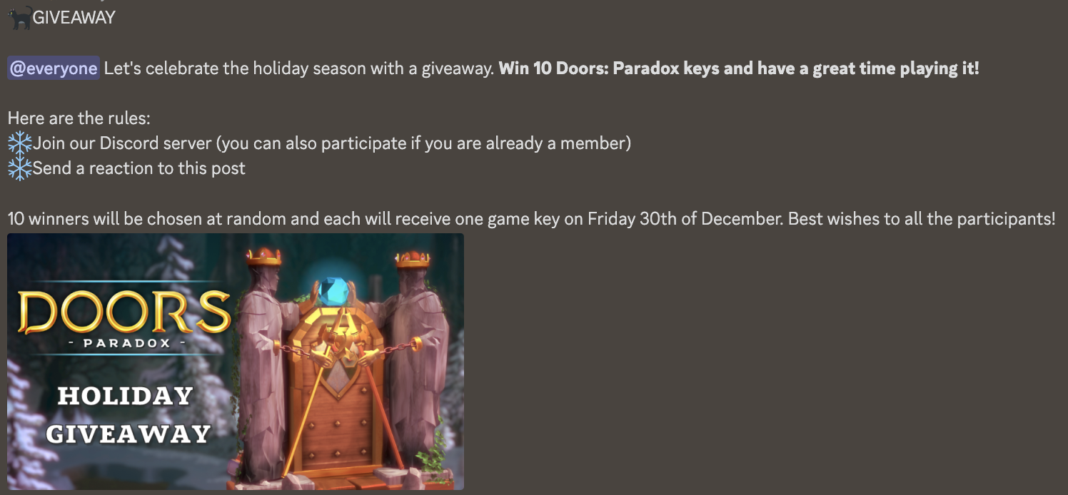 10 winners will be chosen at random and each will receive one game key on Friday 30th of December. Keep an eye on our Discord server for the results