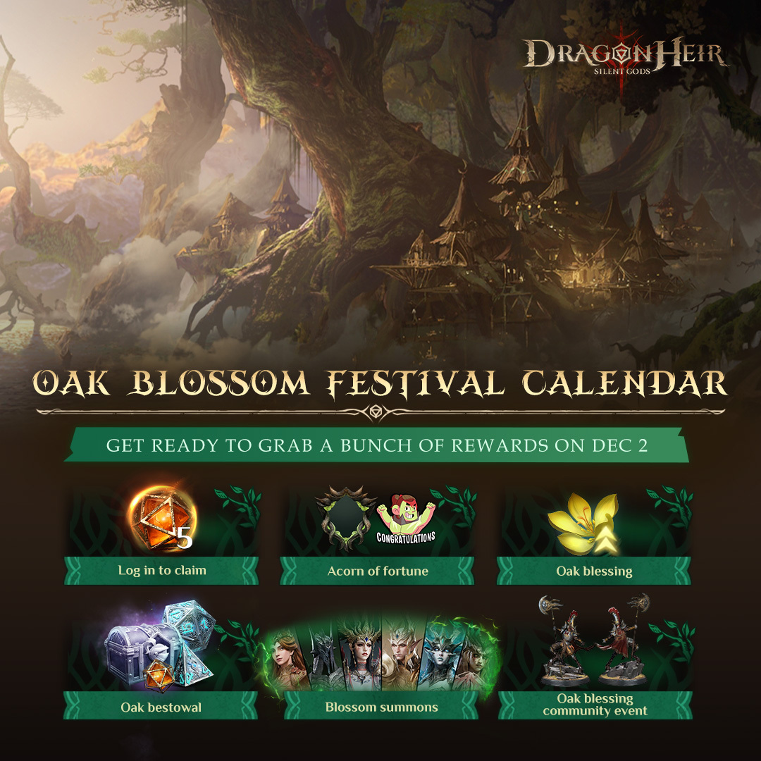 Travelers, the ancient Blue Oak is on the verge of a glorious bloom, and the Oak Blossom Festival is just around the corner! After years of withering, this sacred tree is ready to shine again—join it and celebrate this special moment! ???? Event Starts: December 2 ???? Login To Claim: Get 5 Heliolite Dices upon entry! ????️ Acron of Fortune: Participate to unlock a special avatar exclusive to the festival. ???? Oak Blessing: Empower your journey with a unique event buff. ????Blossom Summon: Choose your favorite elements summon pool to get powerful heroes ???? Oak bestowal: Epic heroes selectable chest limited time return Stay tuned for more details and get ready for the festivities! ???? #dragonheir #dragonheirsilentgods