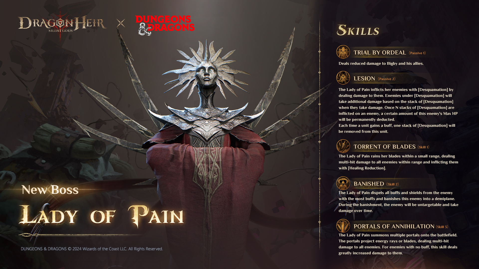 Prepare to encounter the enigmatic Lady of Pain, the Extraplanar Ruler with deadly abilities! ????️ Blade Flurry: The Lady of Pain rains her blades within a small range, dealing multi-hit damage to all and inflicting [Healing Reduction]. ???? Banishment: She dispels all buffs and shields from the enemy with the most buffs and banishes them into a demiplane, making them untargetable and causing damage over time. ???? Portals of Annihilation: She summons multiple portals onto the battlefield, projecting energy rays or blades that deal multi-hit damage to all. Enemies without buffs take greatly increased damage. ????️ Summon your allies and prepare to face the trial of the Lady of Pain! ???? Confront the Extraplanar Ruler #dragonheir #dragonheirsilentgods #downloadnow #DND #collaboration ???? Download Dragonheir NOW: https://bit.ly/downloaddragonheir