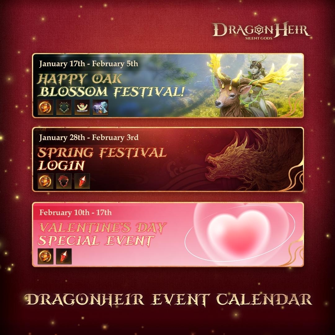 Dear Travelers, Exciting celebrations are just around the corner! Mark your calendars for these upcoming events and prepare to reap incredible rewards as you embark on your adventures. ???? HAPPY OAK BLOSSOM FESTIVAL! January 17th - February 5th ???? SPRING FESTIVAL LOGIN January 28th - February 3rd ???? VALENTINE'S DAY SPECIAL EVENT February 10th - February 17th ✨ Stay tuned for more details as each event approaches! Let the festivities begin! #dragonheir #dragonheirsilentgods #downloadnow ???? Download Dragonheir NOW: https://bit.ly/downloaddragonheir