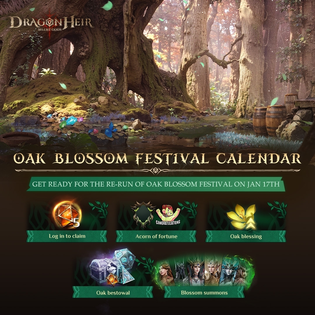 Travelers, the ancient Blue Oak is on the verge of a glorious bloom, and the re-run of Oak Blossom Festival is just around the corner! This sacred tree is ready to shine again—join it and celebrate this special moment! ???? Event Starts: January 17th ???? Login To Claim: Get 5 Heliolite Dices upon entry! ????️ Acron of Fortune: Participate to unlock a special avatar exclusive to the festival. ???? Oak Blessing: Empower your journey with a unique event buff. ????Blossom Summon: Join the Blossom summon to get your favorite heroes Get ready for the festivities! ???? #dragonheir #dragonheirsilentgods #downloadnow ???? Download Dragonheir NOW: https://bit.ly/downloaddragonheir