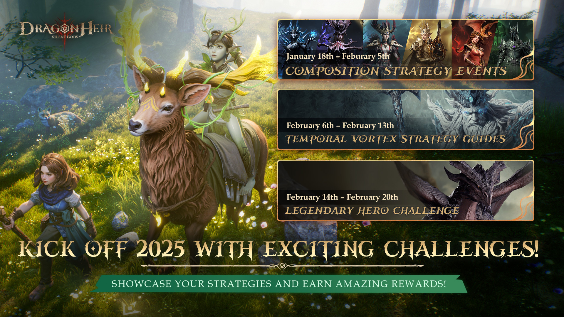 Travelers, the beginning of the year brings thrilling events to showcase your strategies and earn amazing rewards! Here’s what’s in store: ????Composition Strategy Events ???? Event Period: January 18 – February 5 Focus on mastering Wild, Poison, Rally, Dauntless, Frozen, and Summon compositions. Create detailed strategy guides, analyze hero synergies, and share your expertise with the community! ????Weekly Challenge Strategy Guides ???? Event Period: February 6 – February 13 Tackle Weekly Challenges using specified comps and share how to adapt strategies for maximum impact. Your insights can inspire others! ????Legendary Hero Challenge ???? Event Period: February 14 – February 20 Take on the ultimate test by completing Weekly Challenge levels with only a 1-star Legendary Hero comp. Showcase your team optimization and tactical mastery to overcome the toughest dungeons! ???? Exciting Rewards Await! Exceptional strategies and participation will be celebrated with exclusive in-game rewards. ???? Start your year strong—prepare your heroes and join the action! #dragonheir #dragonheirsilentgods #downloadnow ???? Download Dragonheir NOW: https://bit.ly/downloaddragonheir