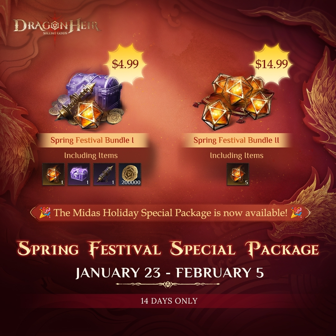 Dear Traveler, The festive season has brought an extraordinary offer just for you! Don’t miss these limited-time bundles packed with amazing rewards to enhance your adventures: ???? Spring Festival Bundle I Heliolite Dice ×1 Epic Hero Selection Box ×1 Scholar's Scroll ×1 Gold Coins ×200,000 Only $4.99! ???? Spring Festival Bundle II Heliolite Dice ×5 Only $14.99! Website link: https://www.midasbuy.com/s/dragon-community ???? Bundle Availability: Jan 23 – Feb 5, 2025 (14 days only!) ✨ Important Reminder: Each account can purchase each bundle once. Log in to the Midas platform to view bundle details and complete your purchase! The specific amount is subject to the actual amount displayed on the page. ???? Don’t wait—secure your bundle today and celebrate the Spring Festival in style! ???? #dragonheir #dragonheirsilentgods #downloadnow ???? Download Dragonheir NOW: https://bit.ly/dragonheirsilentgod