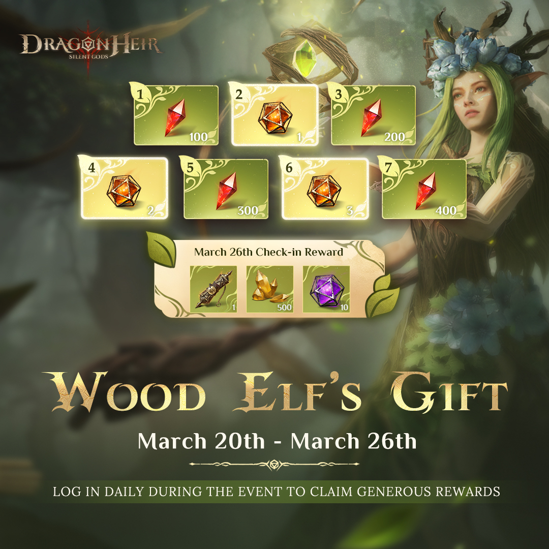 Dear Travelers, The Wood Elves have prepared a special gift for you! Log in daily to claim valuable rewards and power up your journey. ???? Daily Login Rewards: Day 1 (20) – Wyrmarrow×100 Day 2 (21) – Heliolite Dice×1 Day 3 (22) – Wyrmarrow×200 Day 4 (23) – Heliolite Dice×2 Day 5 (24) – Wyrmarrow×300 Day 6 (25) – Heliolite Dice×3 Day 7 (26) – Wyrmarrow×400 ✨ Special Login Bonus – March 26 Master Scroll×1, Essence of Creation×500, Starlight Stone Dice×10. ???? Dungeon Bonus Buff Experience special bonuses and event perks to enhance your Wood Elf’s Gift and empower your adventures! ⏰ Event Period: Login Rewards: March 20 - March 26 Special Buff: March 20 - April 3 Log in tomorrow and claim the Wood Elf’s gift before it’s gone! #dragonheir #dragonheirsilentgods #downloadnow ???? Download Dragonheir NOW: https://bit.ly/dragonheirsilentgod