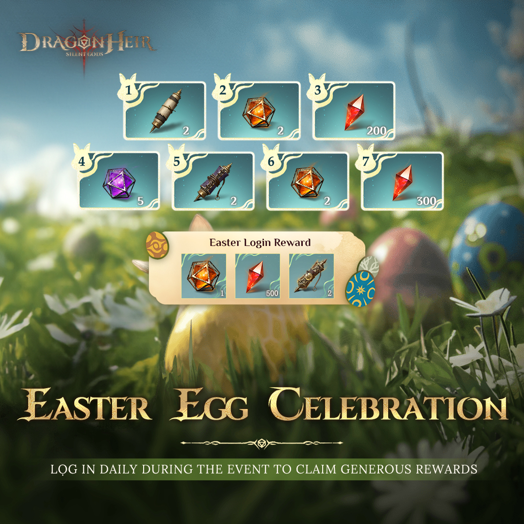 Travelers, it’s time to celebrate Easter in Dragonheir: Silent Gods with a week full of rewards! Log in daily and collect special gifts to empower your adventure. ???? Log in April 20th only to claim: Heliolite Dice*1, Wyrmarrow*500, Master Scroll*2 ???? 7-Day Login Rewards: Log in for 7 consecutive days to earn even more! Day 1: Apprentice Scroll*2 Day 2: Heliolite Dice*2 Day 3: Wyrmarrow*200 Day 4: Starlight Dice*5 Day 5: Scholar Scroll*2 Day 6: Heliolite Dice*2 Day 7: Wyrmarrow*300 ???? Don’t miss this egg-citing opportunity to stock up on valuable rewards. Hop into the game and join the celebration! ???? #dragonheir #dragonheirsilentgods #downloadnow ???? Download Dragonheir NOW: https://bit.ly/dragonheirsilentgod