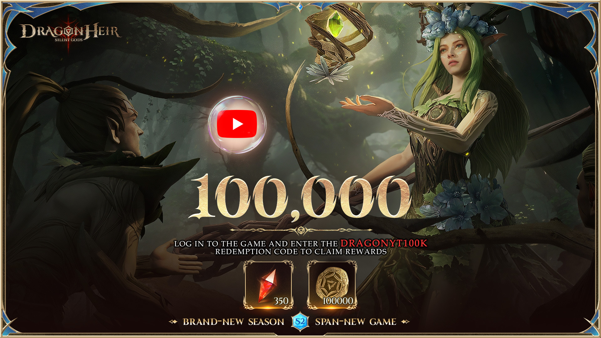 Dear Travelers, We are happy to announce that we are 100k subscribers on our YouTube channel! ???? As a token of our appreciation, we are giving away an unlimited redeem key (one per account) for all our dedicated players to enjoy: ???? How to Redeem: Tap setting >> Service >> Redeem Code Enter the code DRAGONYT100K ???? Rewards: Wyrmarrow x350 Gold x100,000 ⚠️Don't forget to redeem these codes before they expire! (Each account can only redeem the code once) HAPPYNEWYEAR *valid until 2024-03-26 23:59:59 UTC +0 MERRYXMAS *valid until 2024-03-20 23:59:59 UTC +0 DRAGONHEIRS2 *valid until 2024-03-14 23:59:59 UTC +0 DRAGONDC200K Log in now and claim your rewards! Stay engaged with the community for great goods. Here's to many more adventures together in Dragonheir! ✨ ???? Dive Deep,Battle Peak! #dragonheir #dragonheirsilentgods #downloadnow ???? Download Dragonheir NOW: https://bit.ly/dragonheir-downloadnow