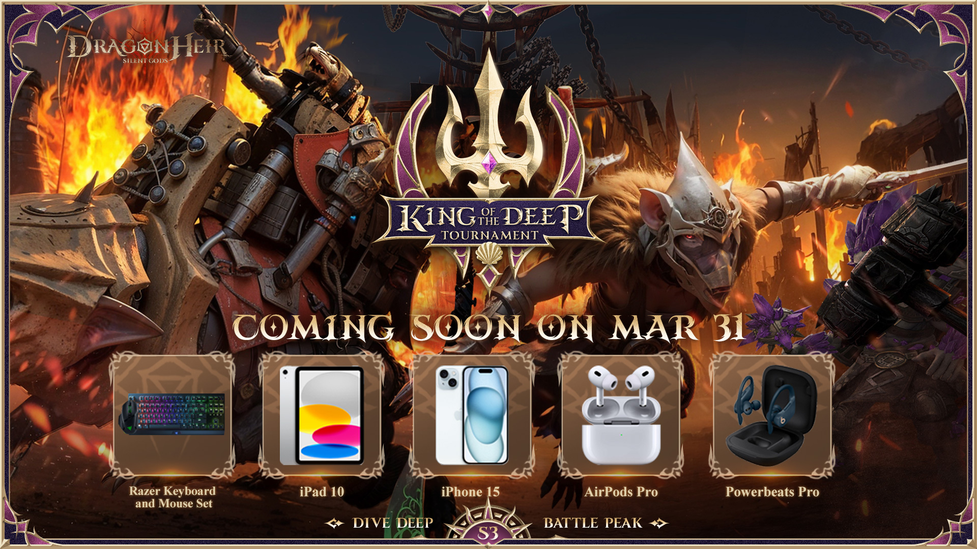 Attention, brave adventurers! The King of the Deep Tournament is on the horizon, and your next challenge awaits. ???? Mark Your Calendars: The first challenge, the Goblin Raid Challenge, kicks off on March 31st. Get ready to dive into action! ???? Rich Rewards Await: Compete for a chance to win incredible prizes, including an iPhone 15, AirPods Pro and more! ???? Don't miss your chance to prove your mettle in the King of the Deep Tournament. Sharpen your skills, gather your allies, and prepare to conquer the challenges that lie ahead. Are you ready to take on the depths? Let the adventure begin! ???????? ???? From the Depths, To the Throne #dragonheir #dragonheirsilentgods #downloadnow ???? Download Dragonheir NOW: https://bit.ly/dragonheir-downloadnow